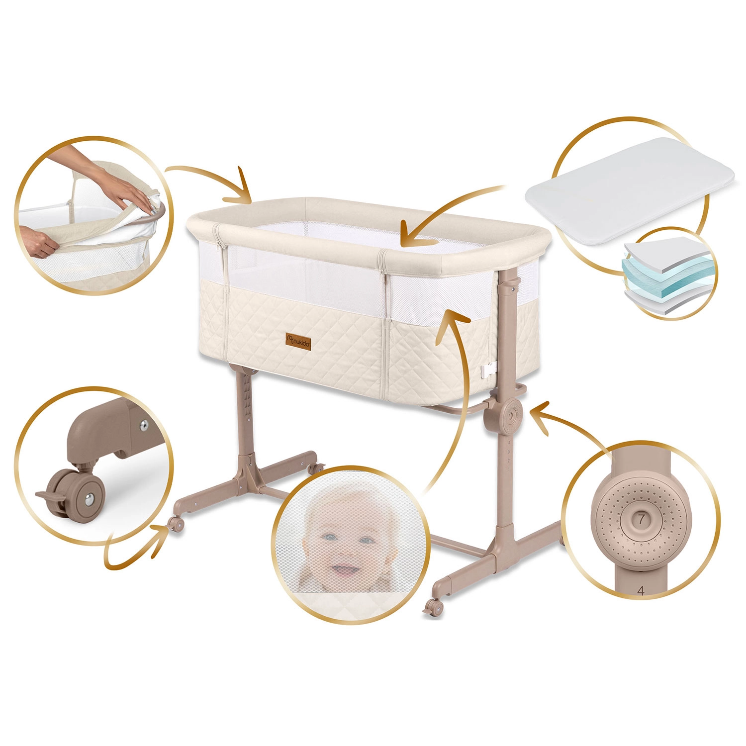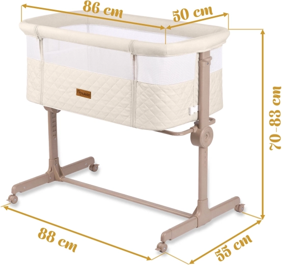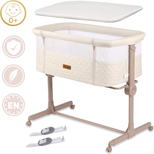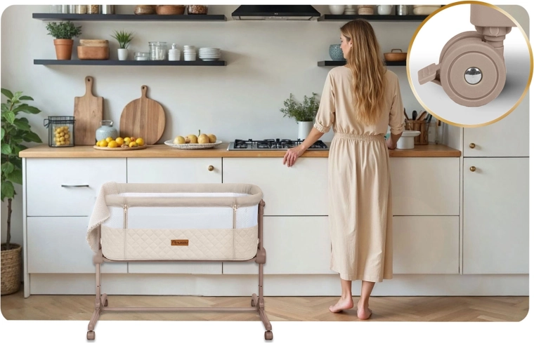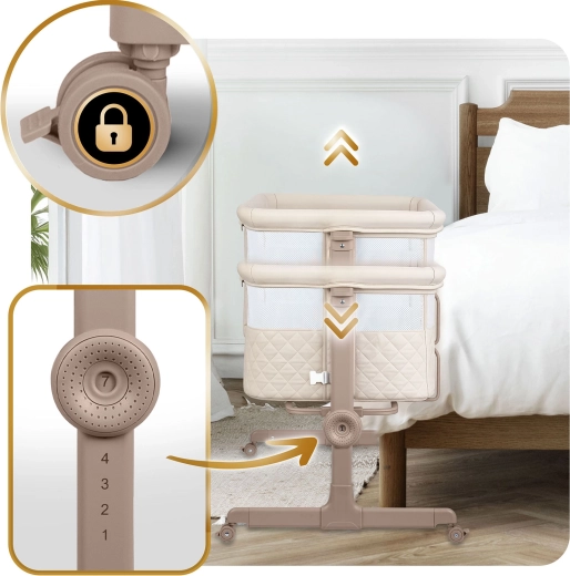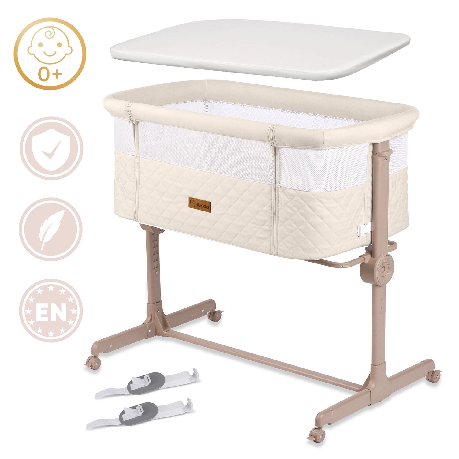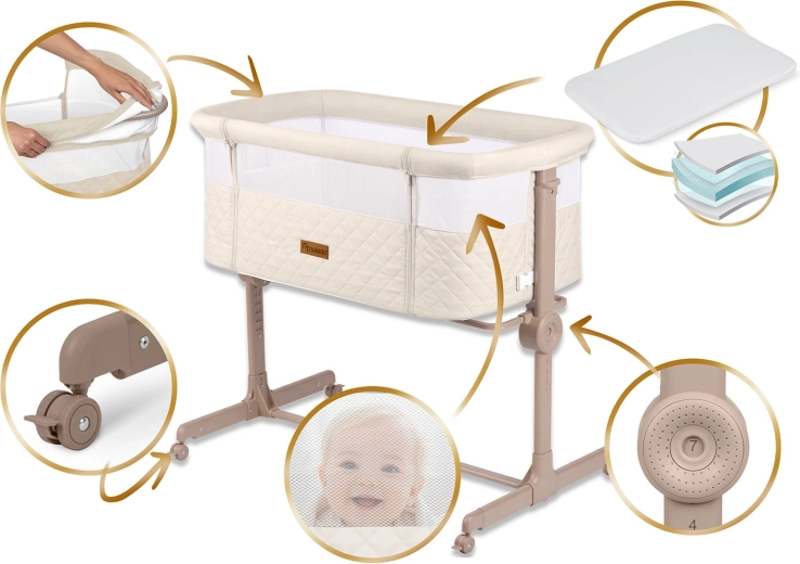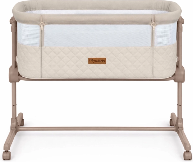Praktická a bezpečná prístavná postieľka NUKIDO pre novorodencov ponúka 7 úrovní výškového nastavenia, nezávislé naklopenie oboch strán pre pohodlie aj pri refluxe, odnímateľný bočný panel na zips pre ľahký nočný prístup a 4 kolieska s brzdami pre mobilitu po dome. Súčasťou je matrac s prateľným poťahom a pásy na bezpečné upevnenie k posteli rodičov.