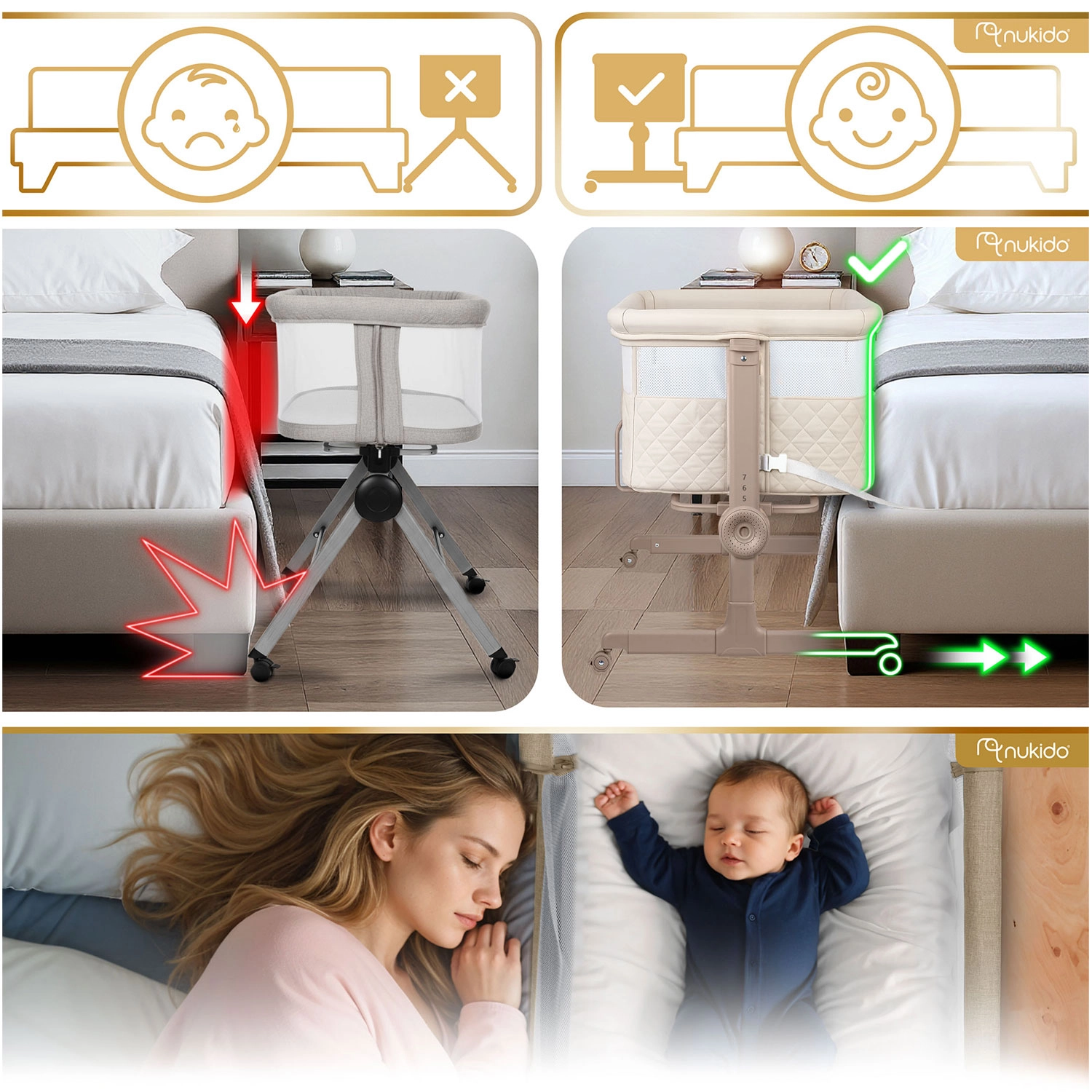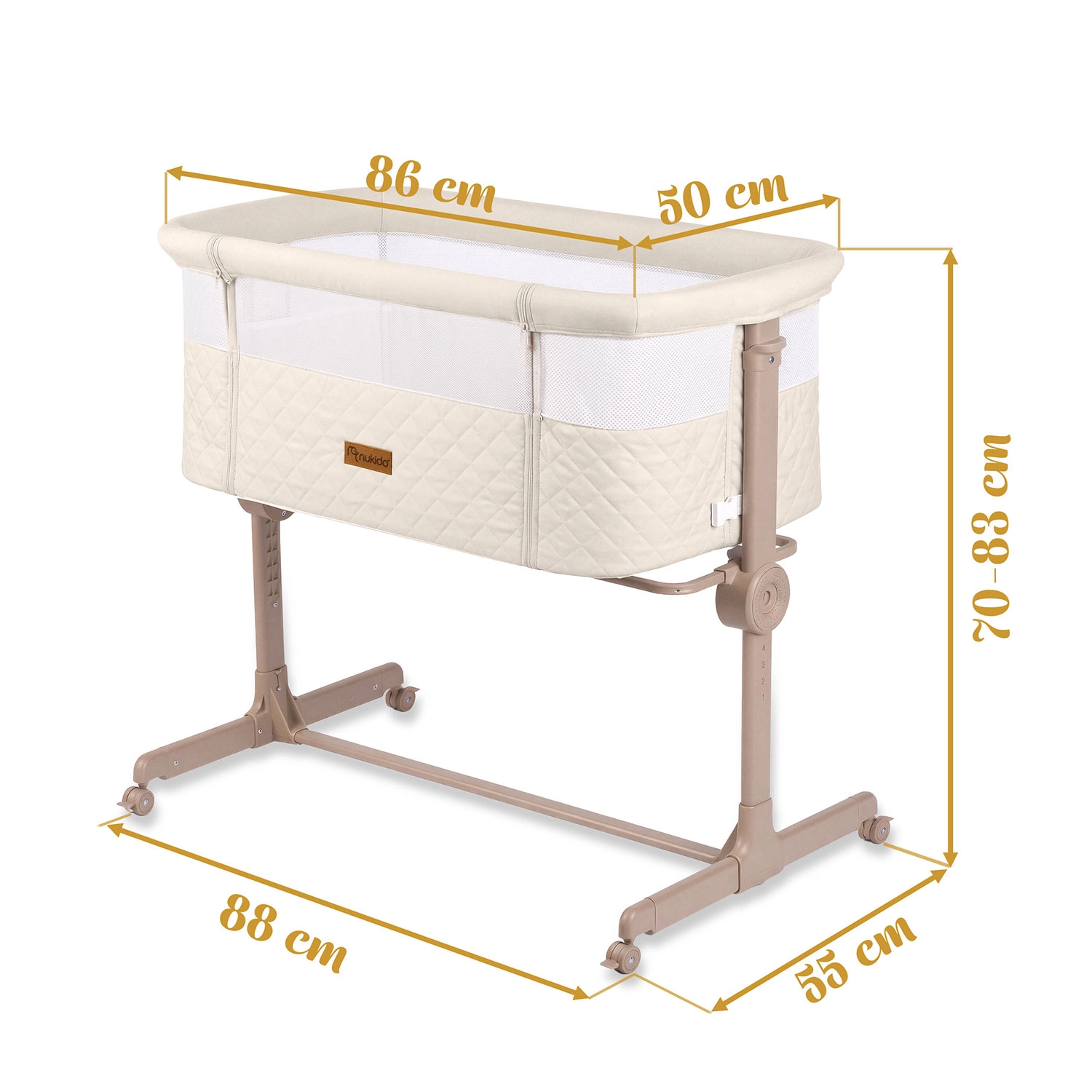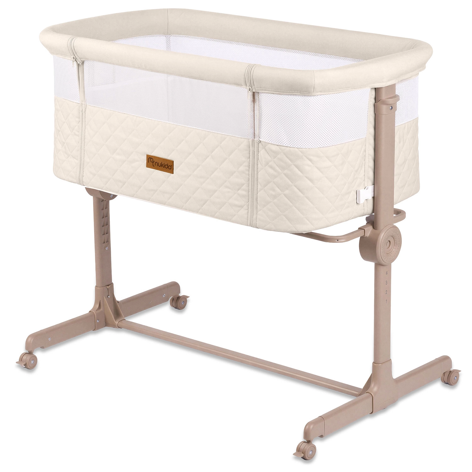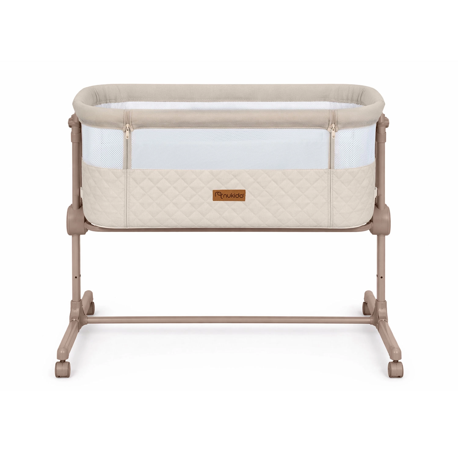Praktická a bezpečná prístavná postieľka NUKIDO pre novorodencov ponúka 7 úrovní výškového nastavenia, nezávislé naklopenie oboch strán pre pohodlie aj pri refluxe, odnímateľný bočný panel na zips pre ľahký nočný prístup a 4 kolieska s brzdami pre mobilitu po dome. Súčasťou je matrac s prateľným poťahom a pásy na bezpečné upevnenie k posteli rodičov.