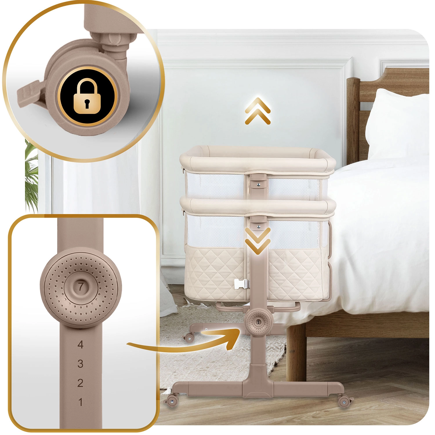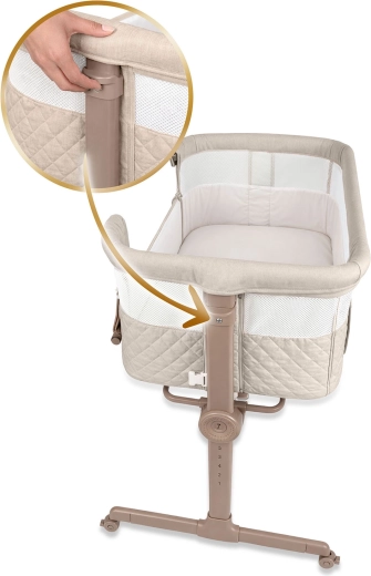 Každú stranu možno nastaviť zvlášť – postieľku ľahko zarovnáte s posteľou rodičov alebo jemne naklopíte pre väčšie pohodlie dieťaťa a úľavu pri refluxe.