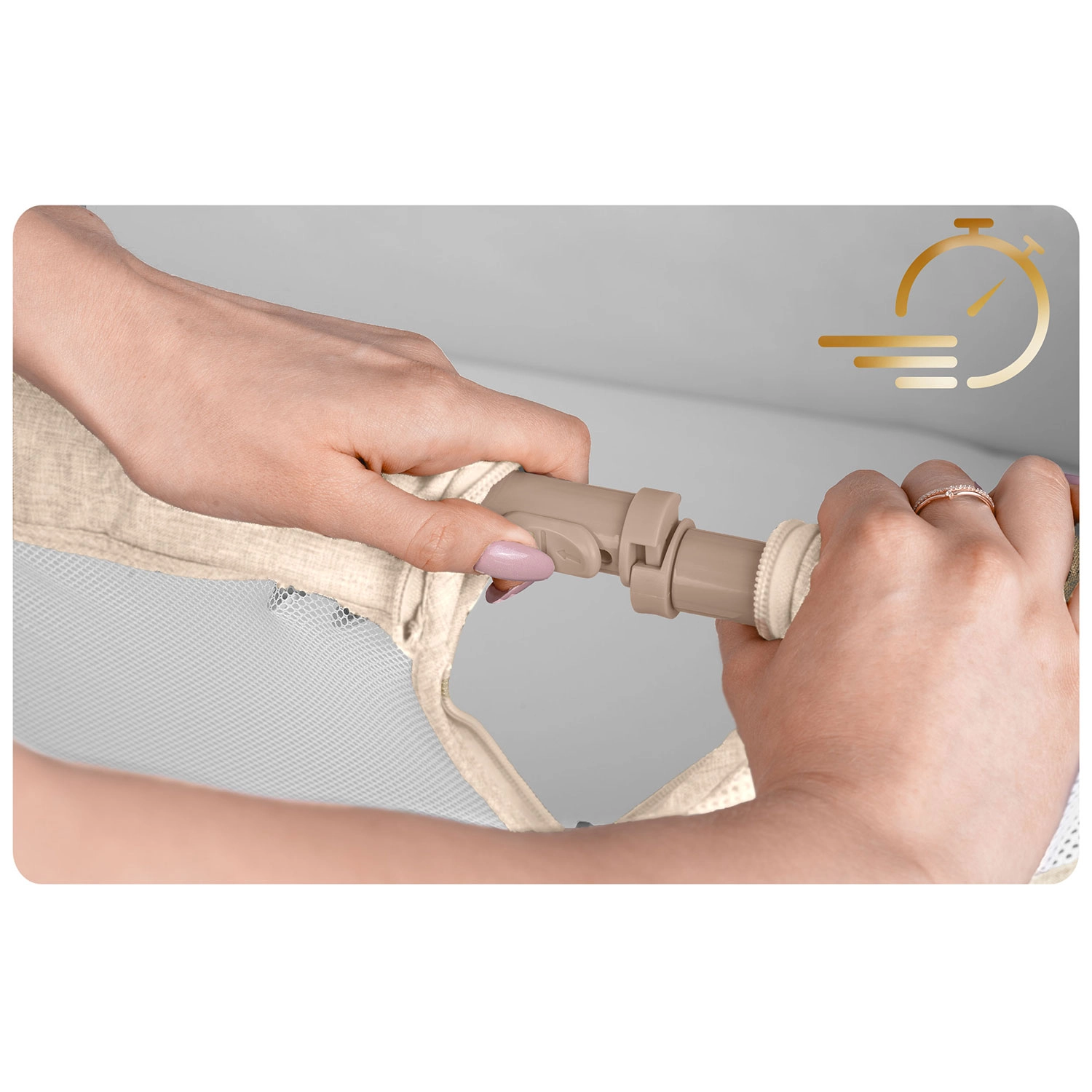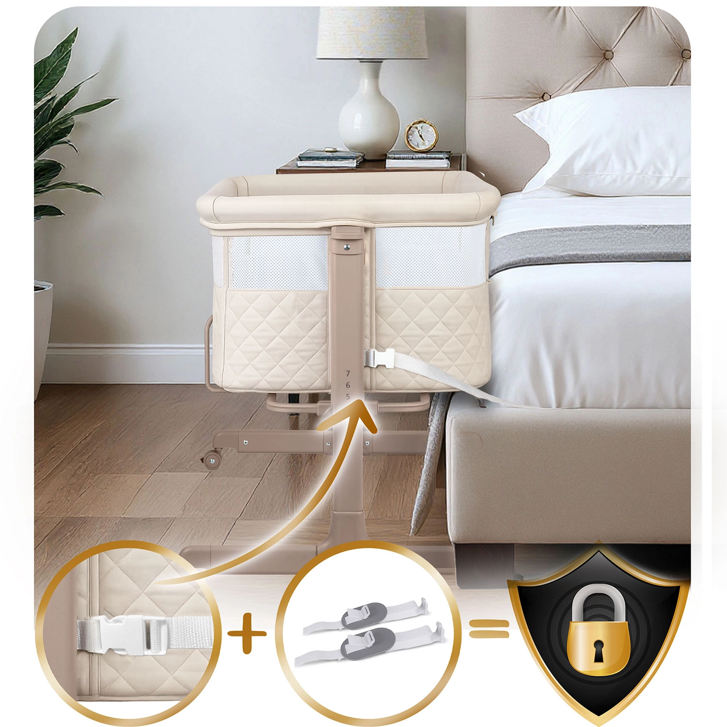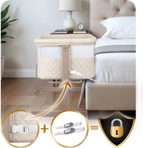 Bočný panel na zips sa otvára smerom von, aby ho dieťa neotvorilo. Upevňovacie pásy pevne spoja postieľku s lôžkom rodičov pre maximálnu stabilitu.