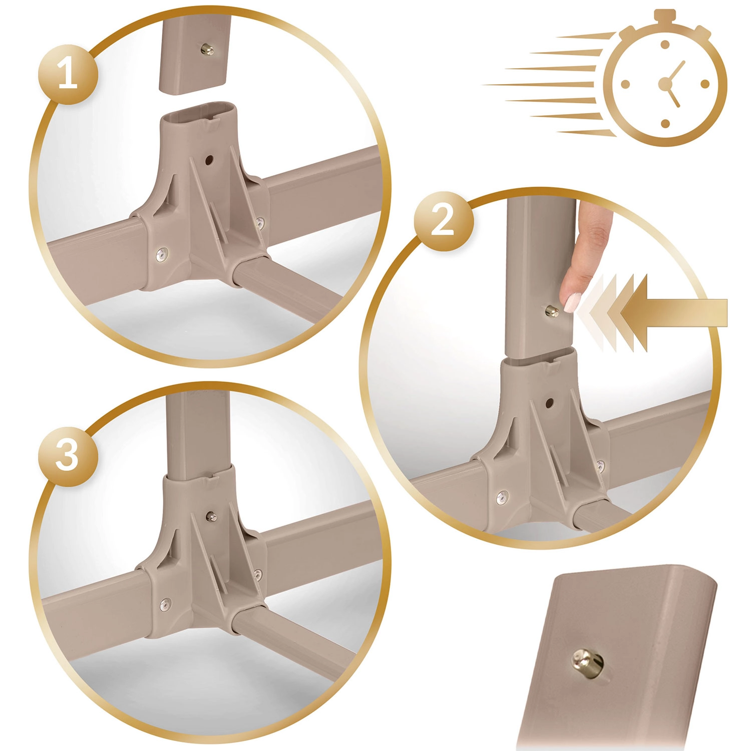 Systém Quick Click umožní bleskovú montáž bez náradia. Poťahy možno zložiť a vyprať, matrac má snímateľný, priedušný poťah.