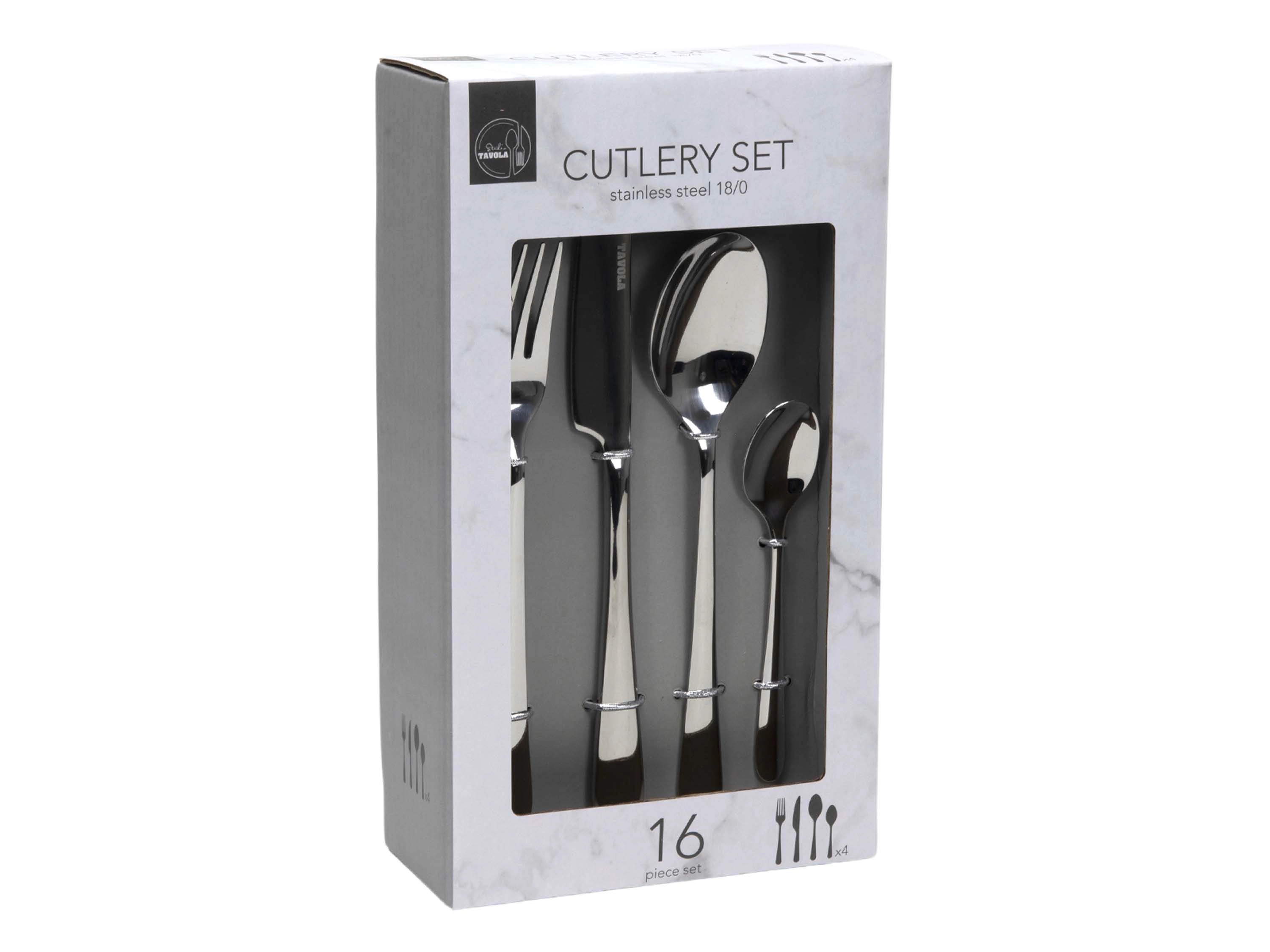 4x jedálenský nôž, 4x jedálenská vidlička, 4x polievková lyžica, 4x čajová lyžička