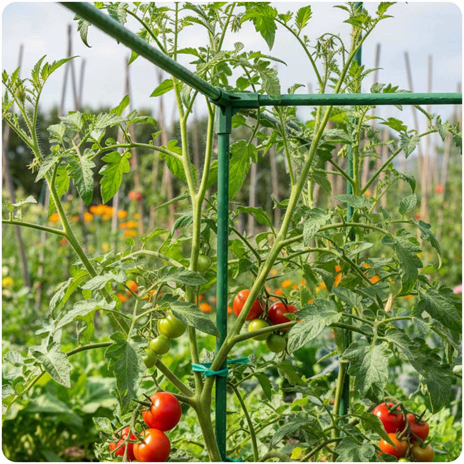 Vytvorte pevné rámy pre paradajky, uhorky či fazuľu. Zelené spojky s tyčami 11 mm udržia rastliny vzpriamené, zlepšia prevzdušnenie aj prístup k zberu.