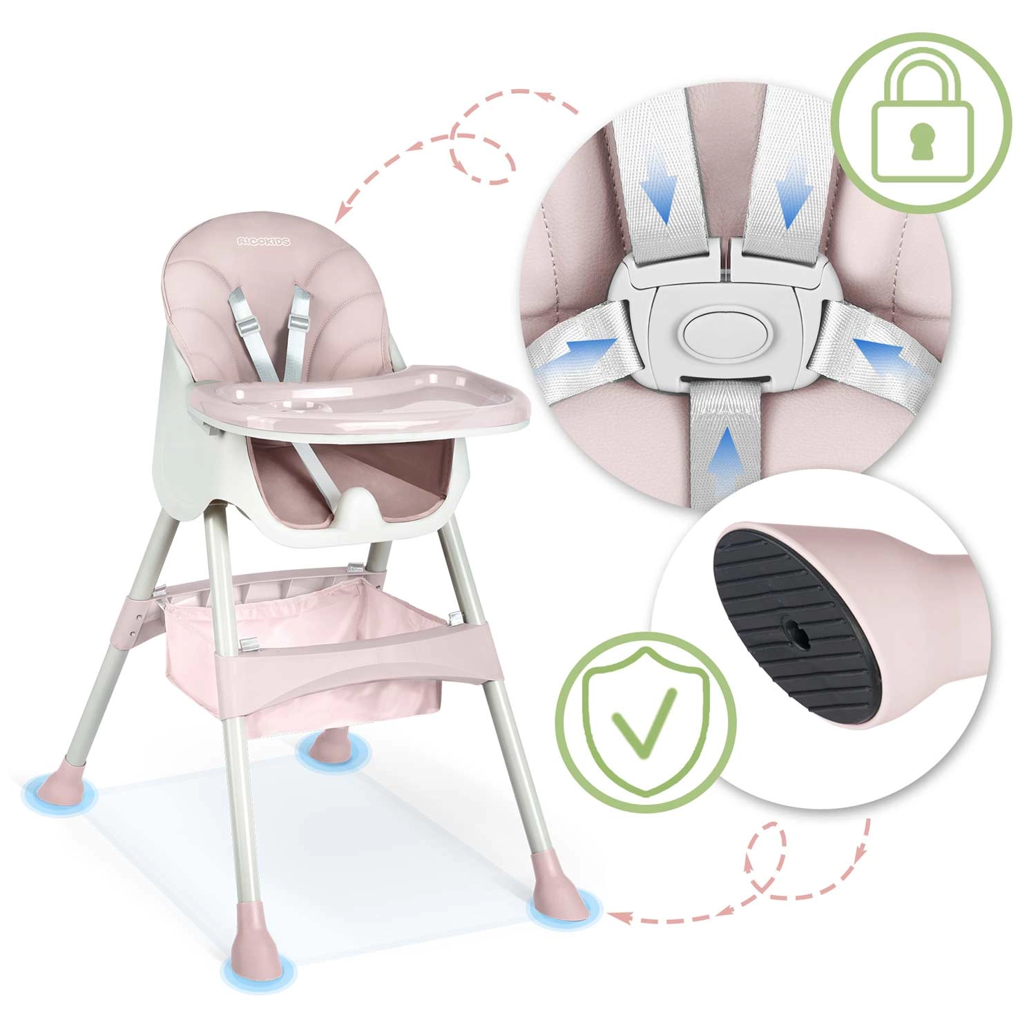 5-bodové pásy, protisklzové nožičky a pevná základňa zaistia stabilné a bezpečné sedenie pri jedle aj hraní.