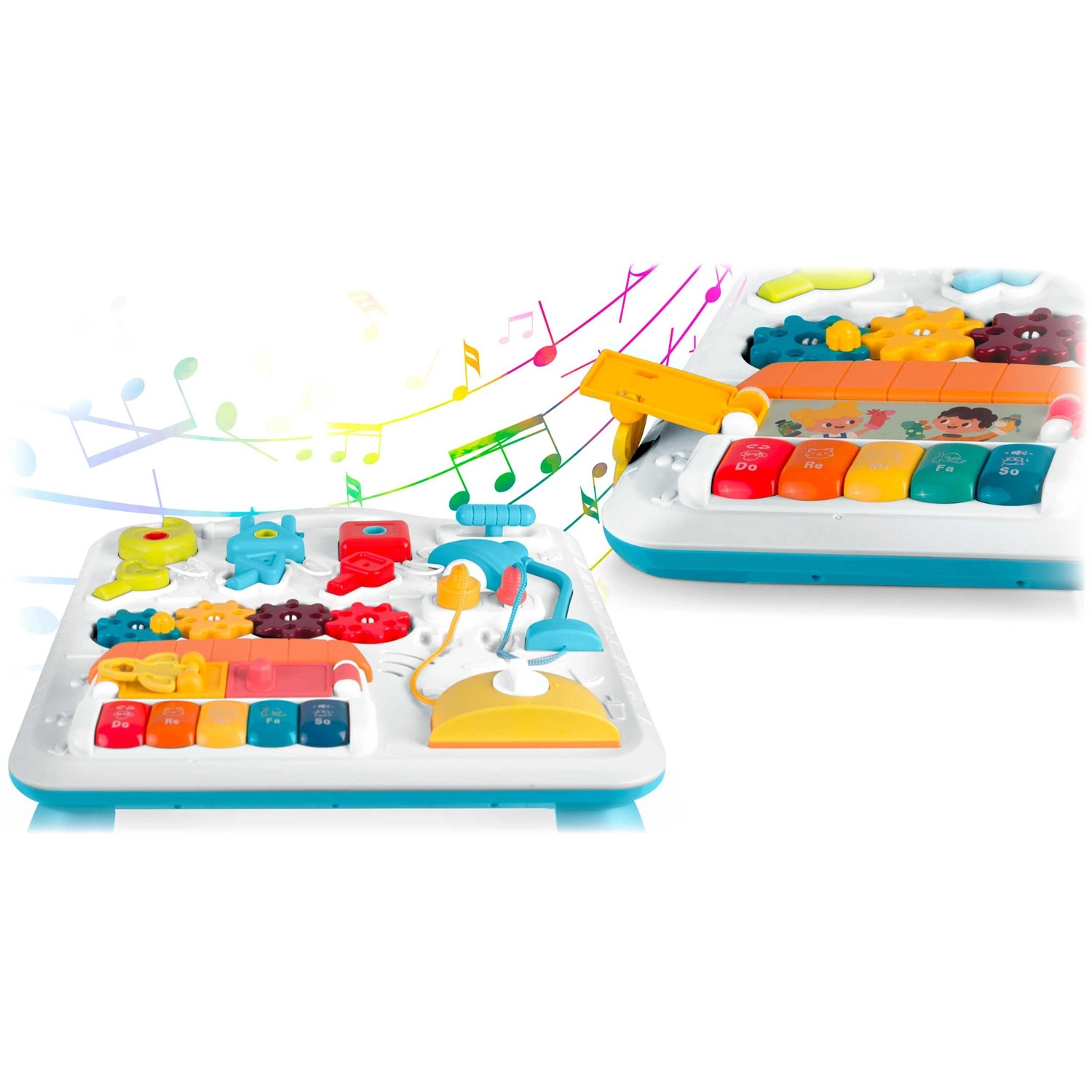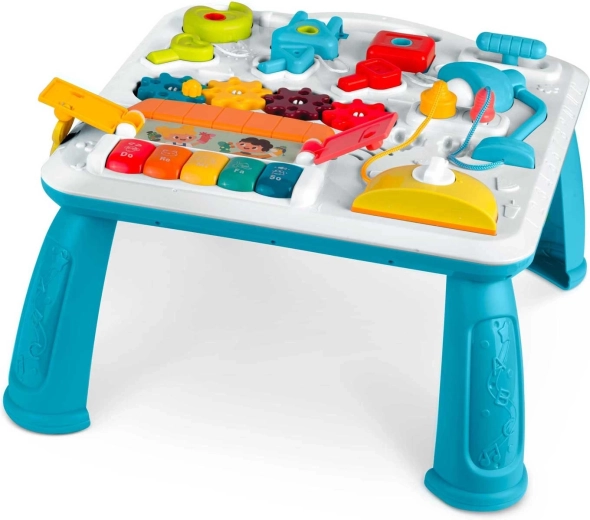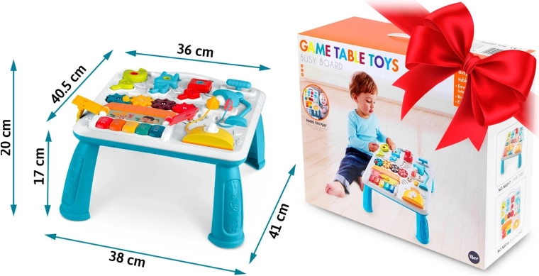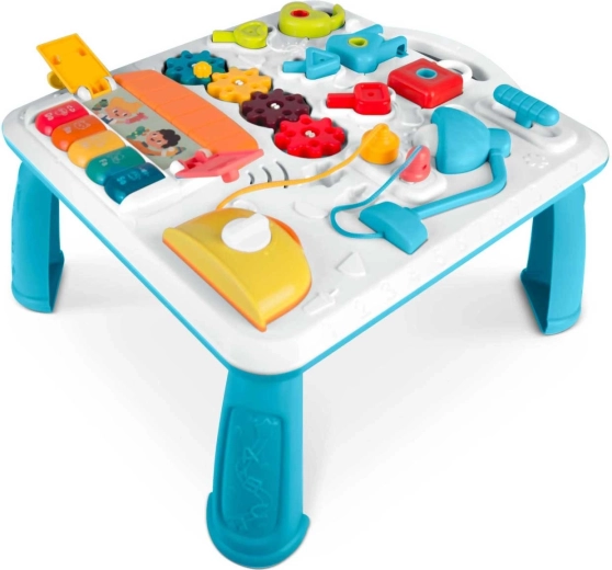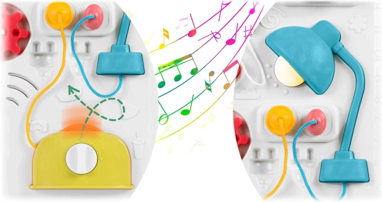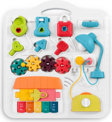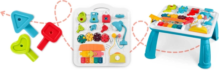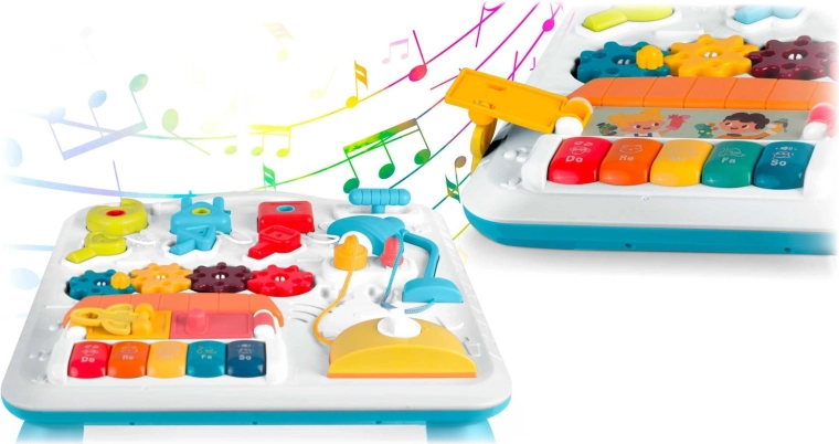 Multifunkčný detský stolík a tabuľa v jednom podporuje senzomotorický rozvoj a učenie hrou. Vďaka odnímateľnému panelu ho dieťa využije pri hraní v stoji aj ako prenosnú senzorickú tabuľu na podlahe či na cestách. Bohatá paleta prvkov – pianínko s tónmi a zvukmi zvieratiek, rozsviecujúca sa lampička, točítka, posuvníky, vysúvací „toster“, domček s dvierkami a tri zámky s kľúčikmi – podporuje koordináciu oko–ruka, logiku aj rozlišovanie tvarov.