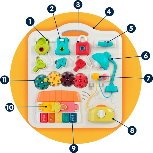 Otočné kolieska, posuvníky, vysúvací „toster“ a tri zámky s kľúčikmi (srdce, trojuholník, obdĺžnik) rozvíjajú úchop, koordináciu a logické myslenie.