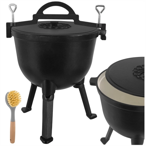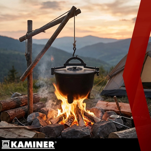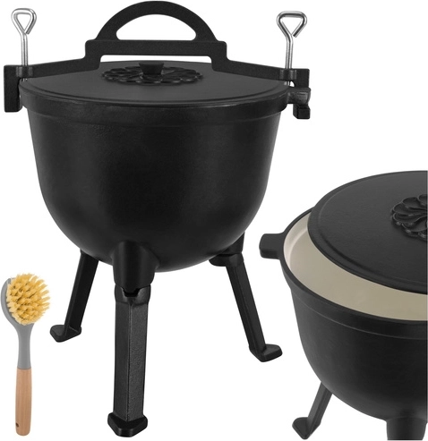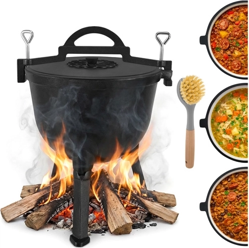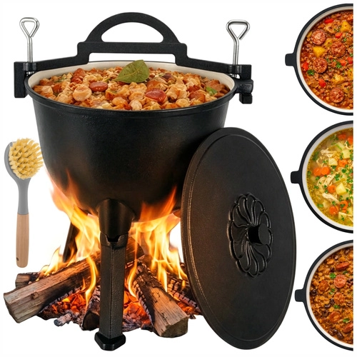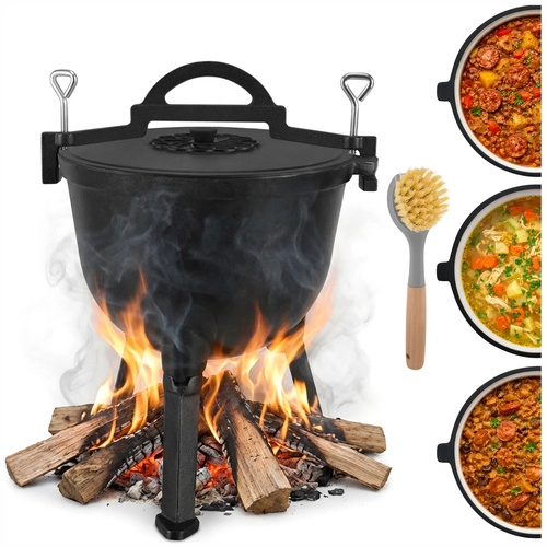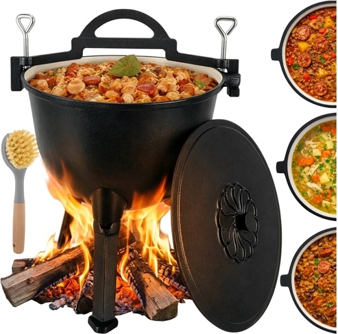 Ideálne na jednohrncové jedlá ako guláš, lečo, fazuľový kotlík, boršč či polievky. Rovnomerné vedenie tepla minimalizuje riziko pripálenia, pokrievka pomáha udržať šťavnatosť a arómu. Odskrutkovateľné nožičky zabezpečujú stabilitu v ohnisku aj kompaktné rozmery pri skladovaní, horná klamra s úchytmi dovolí zavesenie na hák alebo žrď.