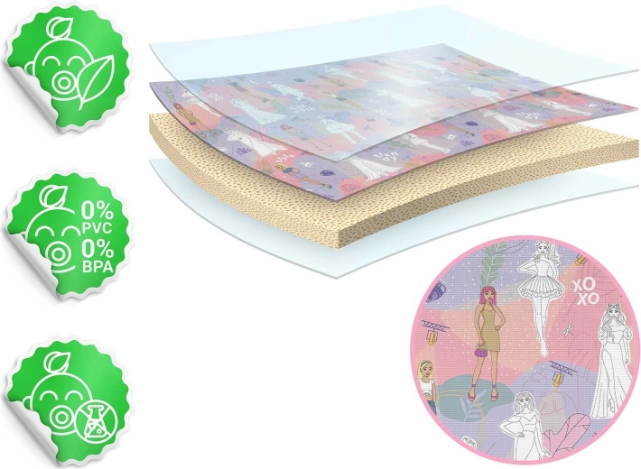 Vytvorte deťom kreatívny kútik kdekoľvek doma aj vonku. Veľkoformátová omaľovánková podložka s motívmi Fashion poskytne pohodlnú, mäkčenú plochu na maľovanie, hranie aj prvé lezenie. Špeciálny povrch rýchlo schne, farby zostávajú na podložke a nešpinia ruky ani okolie. Po zábave všetko jednoducho zotriete vlhkou handričkou bez chémie a je pripravené na ďalšie kolo tvorenia.