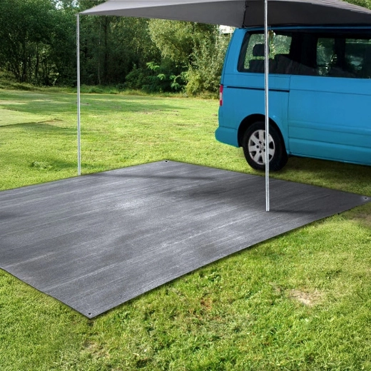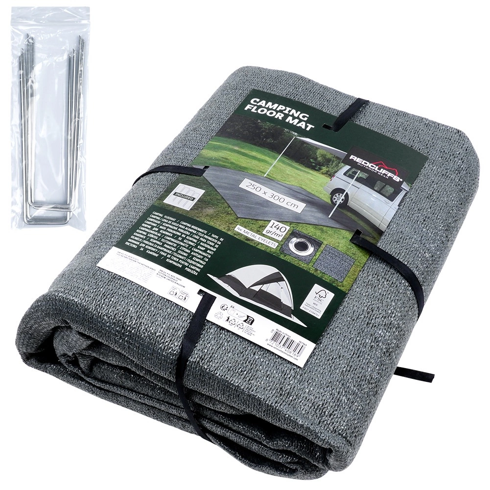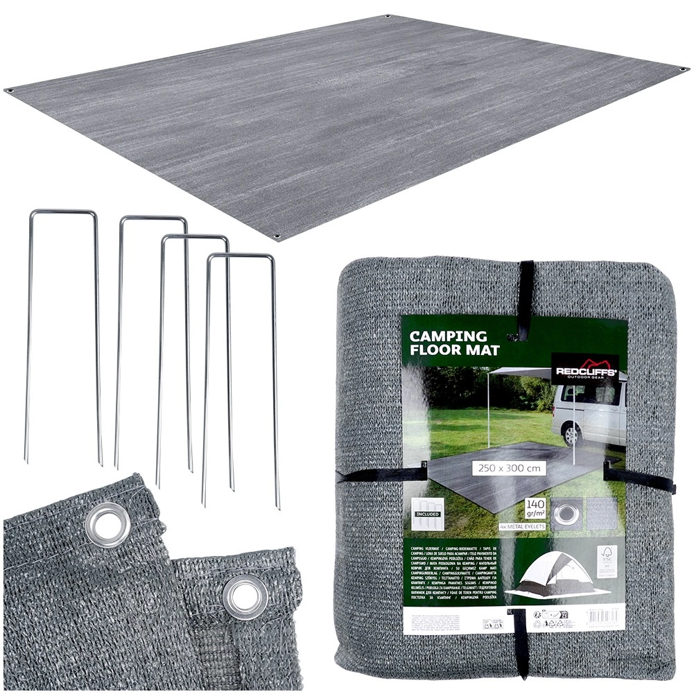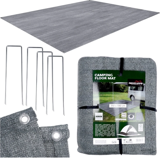 Praktická podlahová podložka do stanu a predsiene s rozmermi 250 × 300 cm zaistí pri kempovaní čistotu, sucho a vyšší komfort. Je vyrobená z odolnej a ľahko umývateľnej sieťovanej tkaniny v sivej farbe, má kovové očká na ukotvenie a v balení nájdete aj 4 kolíky na stabilné prichytenie. Vhodná tiež pod markízu karavanu, do altánku, na pláž či piknik.