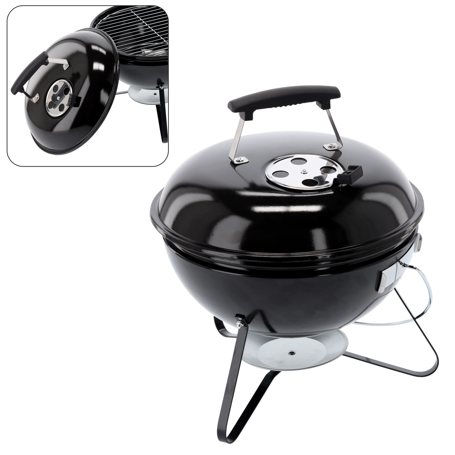 Gril je vybavený chrómovaným roštom s priemerom 35 cm a pozinkovaným uhlíkovým roštom. Stabilnú konštrukciu zaisťujú tri oceľové nohy a praktická miska na popol. Nízka hmotnosť a malé rozmery z neho robia perfektnú voľbu na chatu, kemping aj balkón.