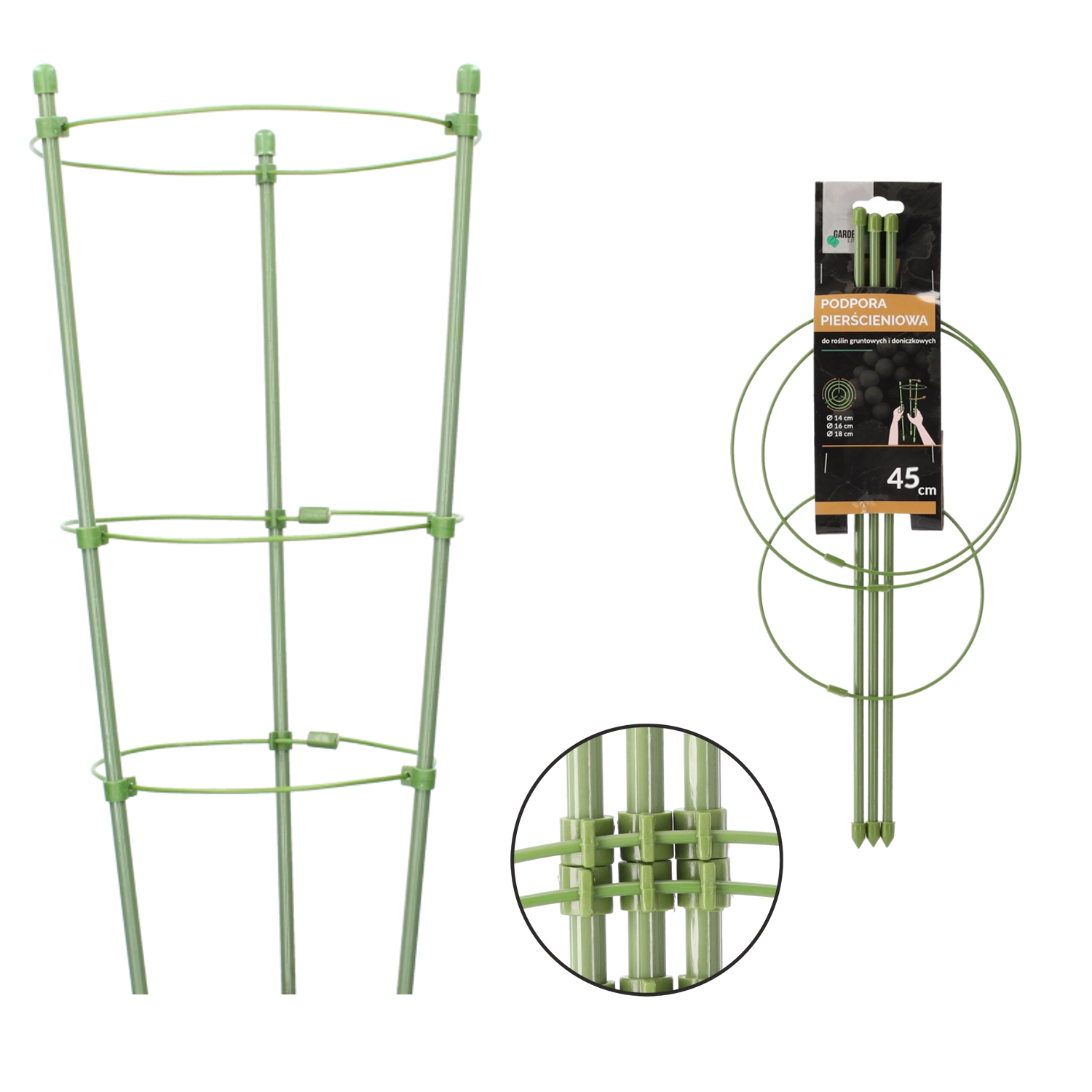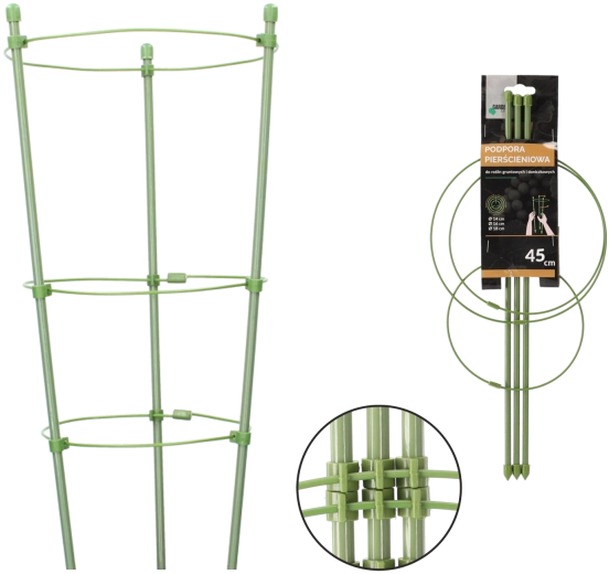Praktická kruhová opora pre kvety a kry z odolnej kovovej konštrukcie s polyetylénovým povrchom. Vďaka zelenej farbe splynie s porastom, poskytne stabilnú oporu a zabráni poliehaniu rastlín aj pri vetre. Ideálna pre čučoriedky, hortenzie a rastliny v kvetináčoch.