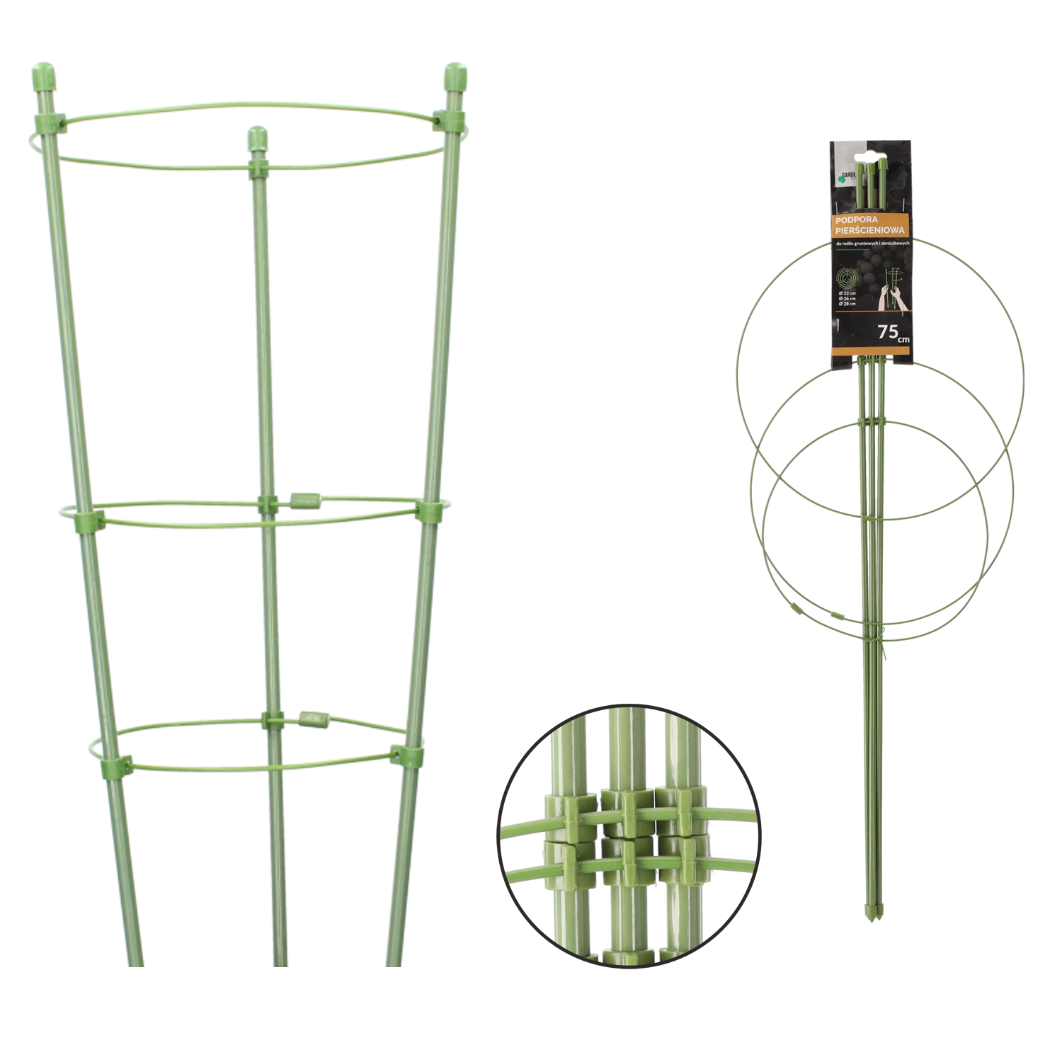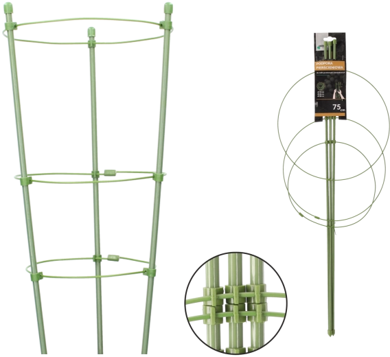 Táto praktická opora s trojicou kruhov je ideálna pre hortenzie, čučoriedky alebo vyššie trvalky a okrasné rastliny. Kovová konštrukcia s polyetylénovým poťahom poskytuje dlhú životnosť a spoľahlivú oporu aj pri vetre. Zelený povrch nenarúša vzhľad záhona ani kvetináča.