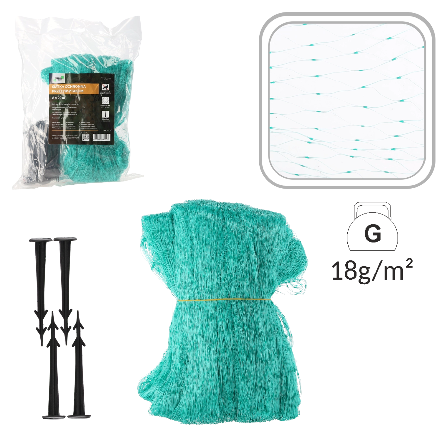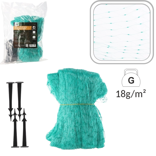Odolný polypropylén zaručuje dlhú životnosť a možnosť používania počas viacerých sezón. Oka 35 × 35 mm účinne bránia prieniku vtákov, zároveň však umožňujú rastlinám dýchať a prepúšťajú svetlo aj dážď. Inštalácia je rýchla a jednoduchá – s 16 kotviacimi kolíkmi sieť pevne zaistíte k zemi či konštrukcii.