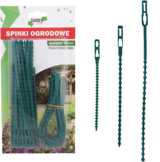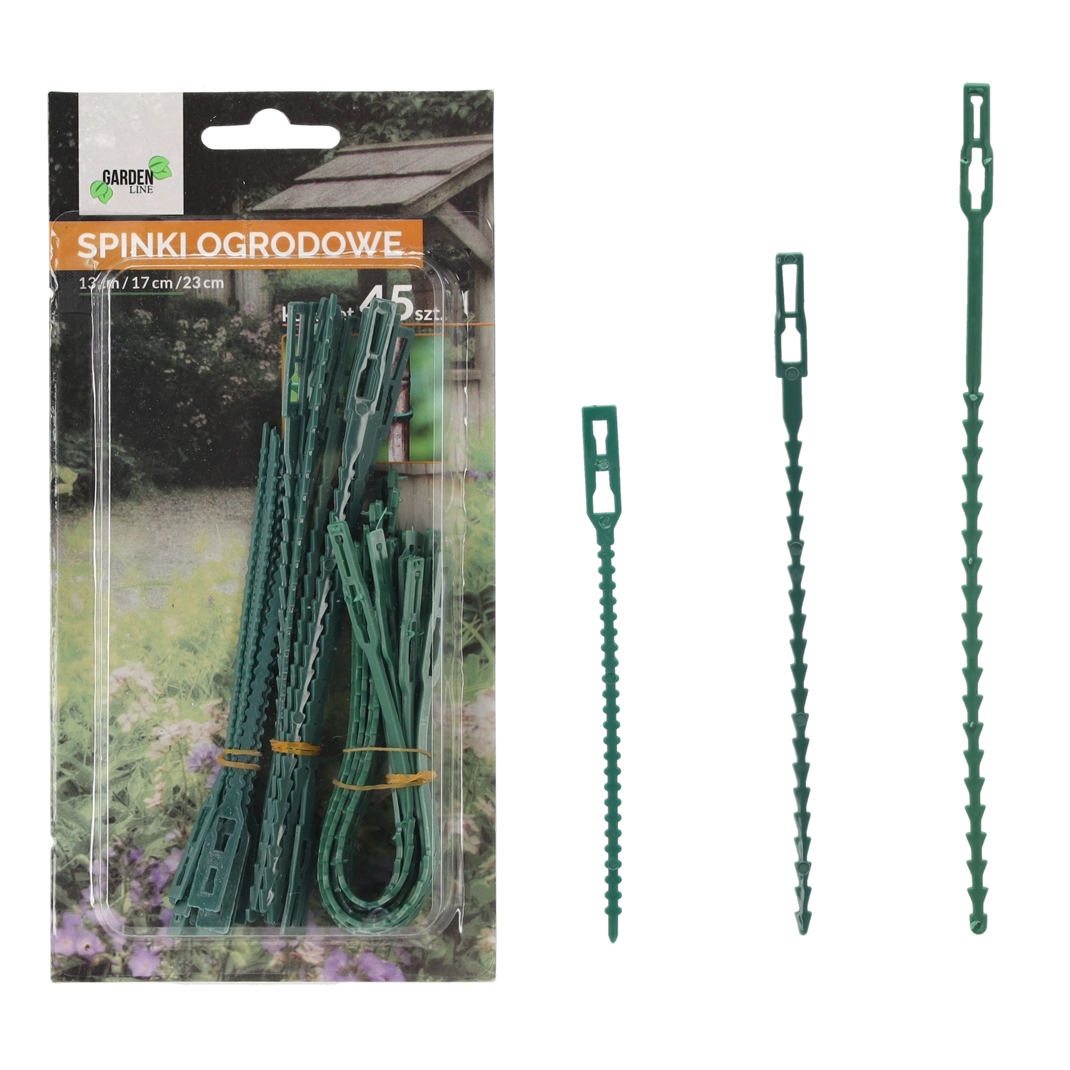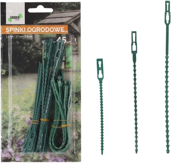 Praktická súprava 45 záhradných spôn s dĺžkami 13, 17 a 23 cm na spoľahlivé upevnenie rastlín k oporám bez poškodenia stoniek. Odolný a pružný plast zabezpečí opakované použitie, pričom zelená farba nenápadne splynie so záhonmi, skleníkom aj balkónom.