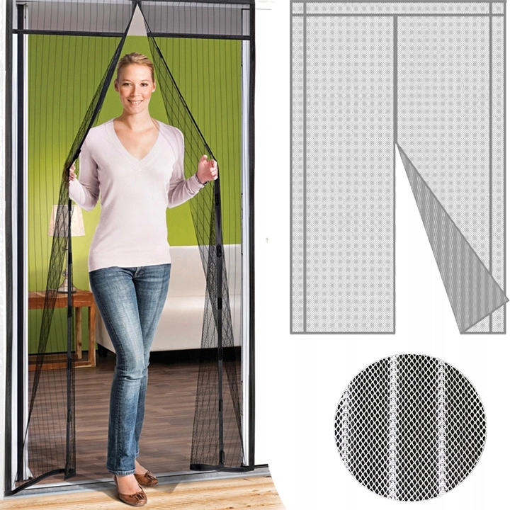 Inštalácia je rýchla a bez vŕtania – jednoducho ju pripevníte okolo rámu dverí. Sieť možno zastrihnúť pre perfektné usadenie do šírok 80/90/100 cm a výšok 200/210 cm. Magnetické zapínanie zabezpečujú po celej dĺžke panely a pomocné magnety, takže sieť spoľahlivo drží zatvorená aj pri častom priechode detí či domácich miláčikov.