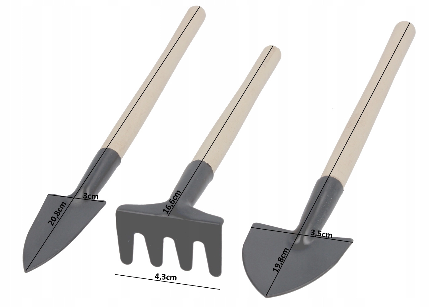 Sada záhradných nástrojov – lopatka, transplantér a hrabličky s drevenou rukoväťou