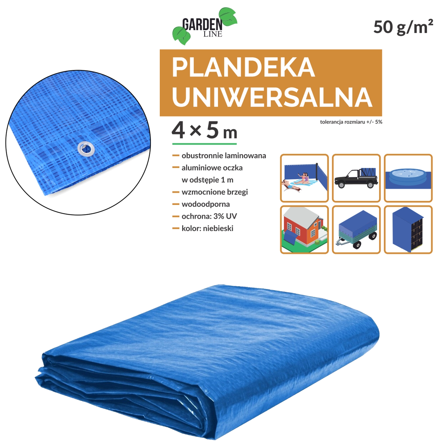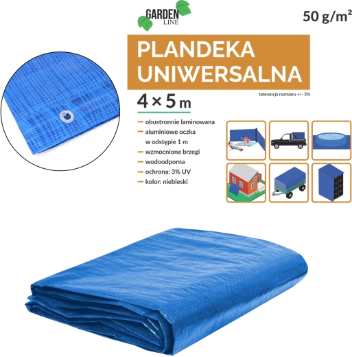 Univerzálna PE plachta 5 × 4 m spoľahlivo chráni pred dažďom, prachom a nečistotami. Vďaka obojstrannej laminácii je vodotesná a ľahko sa udržiava. Hliníkové očká po obvode (cca po 1 m) umožnia rýchle a isté uchytenie, zatiaľ čo okraje vystužené polypropylénovým povrázkom zvyšujú odolnosť proti natrhnutiu.