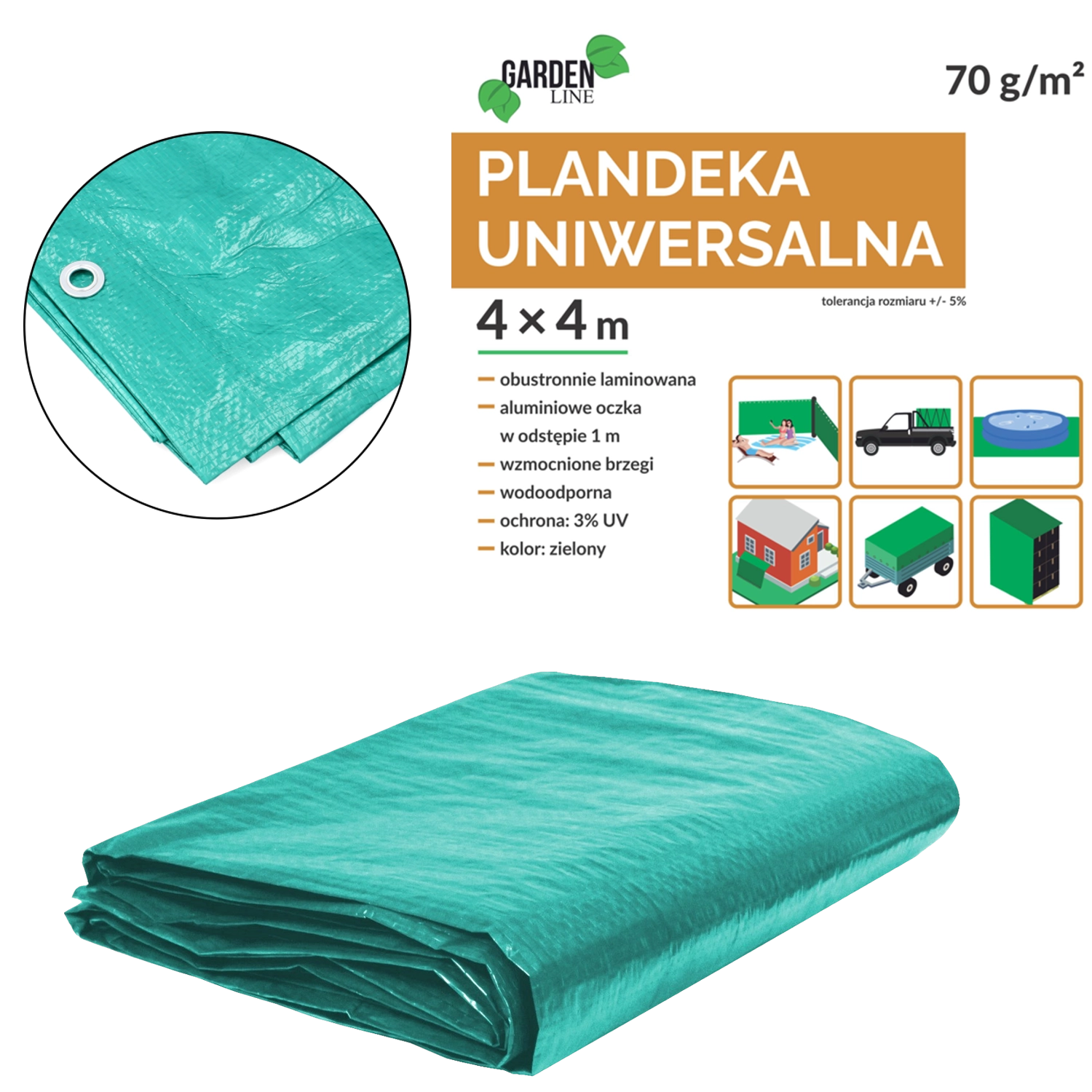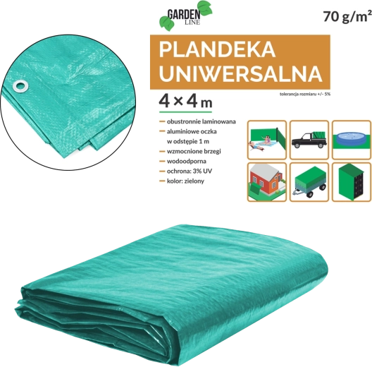 Univerzálna krycia plachta z kvalitného PE s gramážou 70 g/m² chráni pred dažďom, prachom a slnkom. Je obojstranne laminovaná, so spevnenými okrajmi so šnúrou a hliníkovými očkami po 1 m. Zelené prevedenie, UV ochrana 3 %, rozmer 4 × 4 m (+/−5 %).