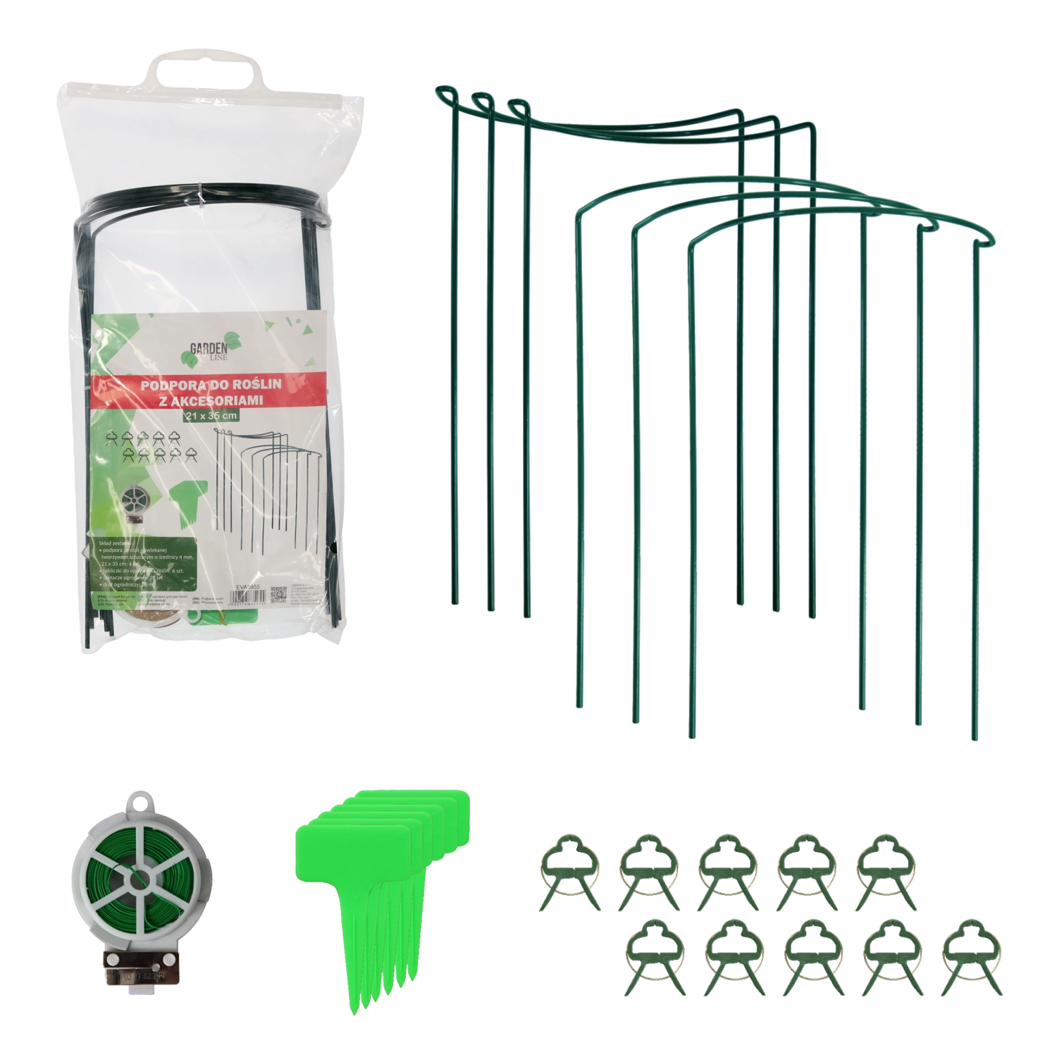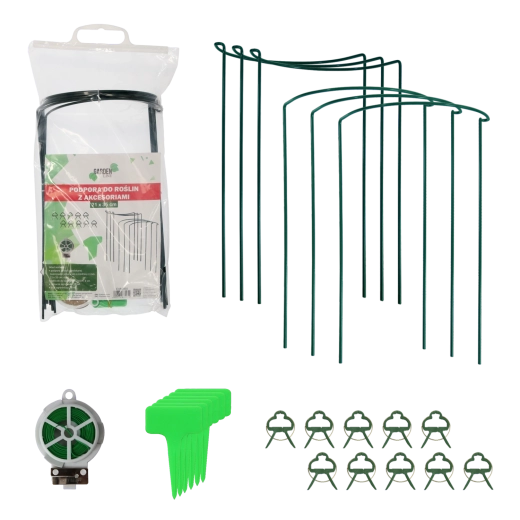 Praktická záhradná podpora pre kvety a okrasné rastliny z pevnej ocele s plastovým povrchom. Vďaka zelenej farbe je nenápadná, zároveň stabilizuje stonky a podporuje harmonický rast. Súčasťou je kompletná sada príslušenstva na ľahké uchytenie a označenie rastlín.