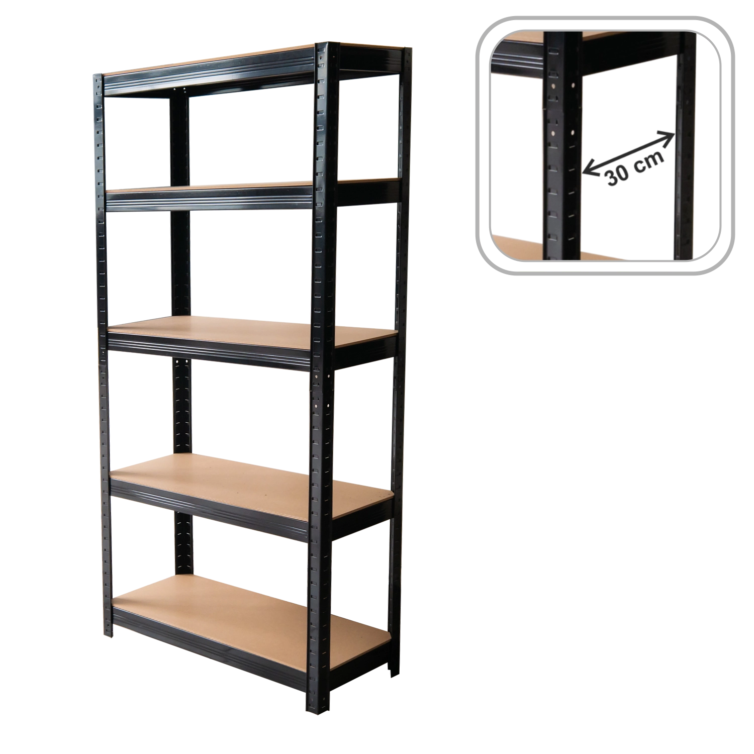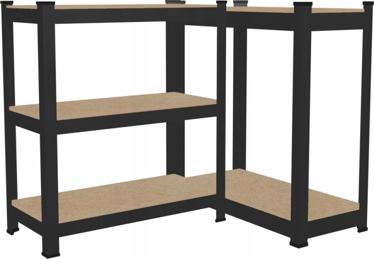 Galvanizované oceľové profily a HDF police zaručujú dlhú životnosť. Čierne prevedenie pôsobí moderne a hodí sa do garáže, dielne aj domácnosti.