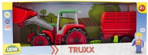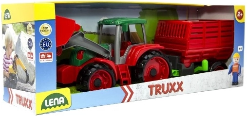 Predstavujeme vám Lena Truxx traktor s vlekom, ideálnu hračku pre malých farmárov. Tento plastový traktor vyniká svojim robustným dizajnom v červenej a zelenej farbe, ktorý je doplnený funkčnou lyžicou a odnímateľným vlekom. V kabíne traktoru je umiestnená malá figúrka vodiča, ktorá dodáva hre na realistickosti.