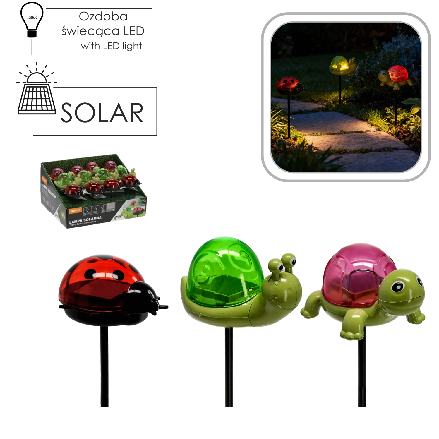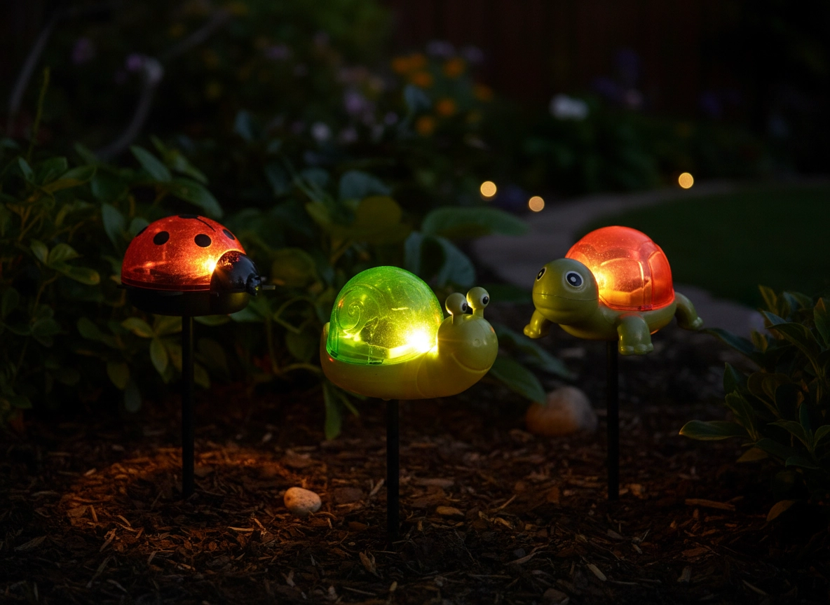 Korytnačka, slimák a lienka s farebnými polopriehľadnými „kruniermi“/škrupinkami dodajú každej výsadbe veselý akcent a večer ju jemne podsvietia teplým svetlom.