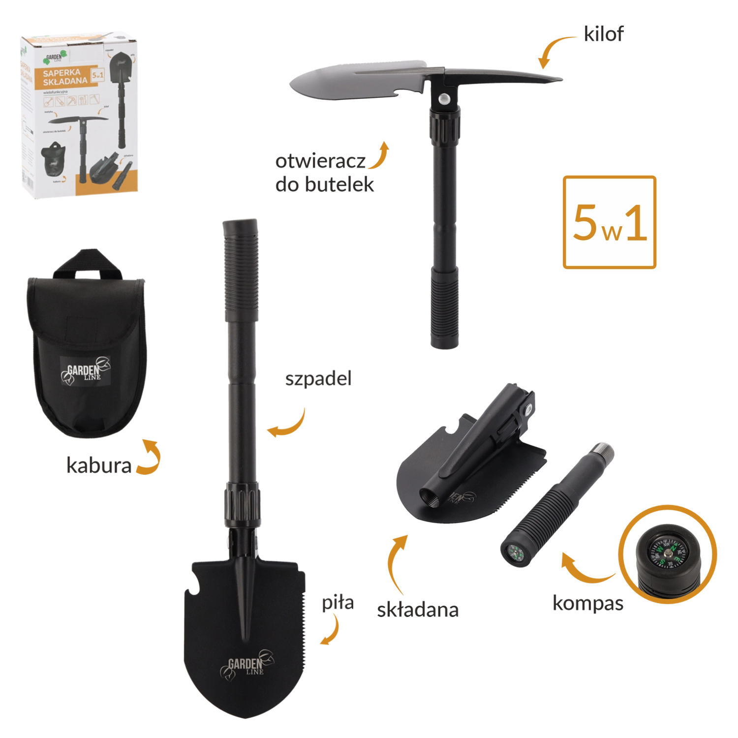 Táto všestranná skladacia lopatka je ideálna pre outdoorových nadšencov, táborníkov aj majiteľov záhrad. V jednom kompaktnom nástroji získate 5 praktických funkcií, ktoré využijete pri budovaní tábora, príprave ohniska, v núdzových situáciách aj pri drobných zemných prácach.