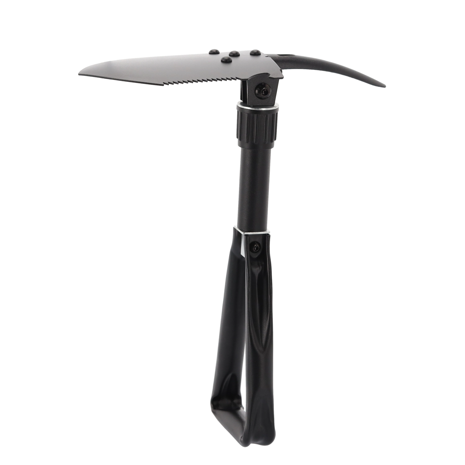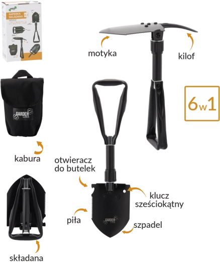 Lopatka, motyka, píla, krumpáč, šesťhranný kľúč a otvárač fliaš – univerzálna výbava na kempovanie, survival aj prácu v záhrade.
