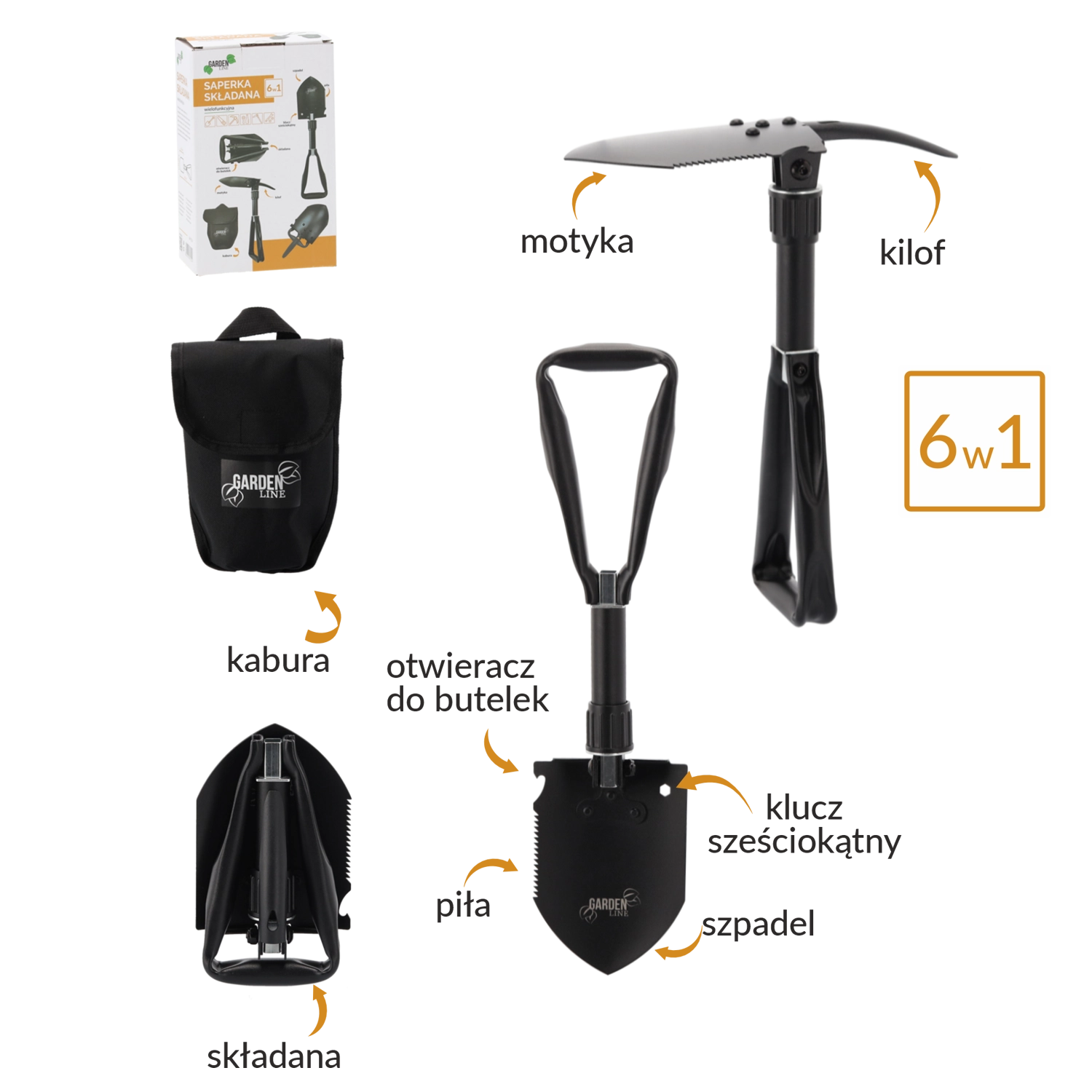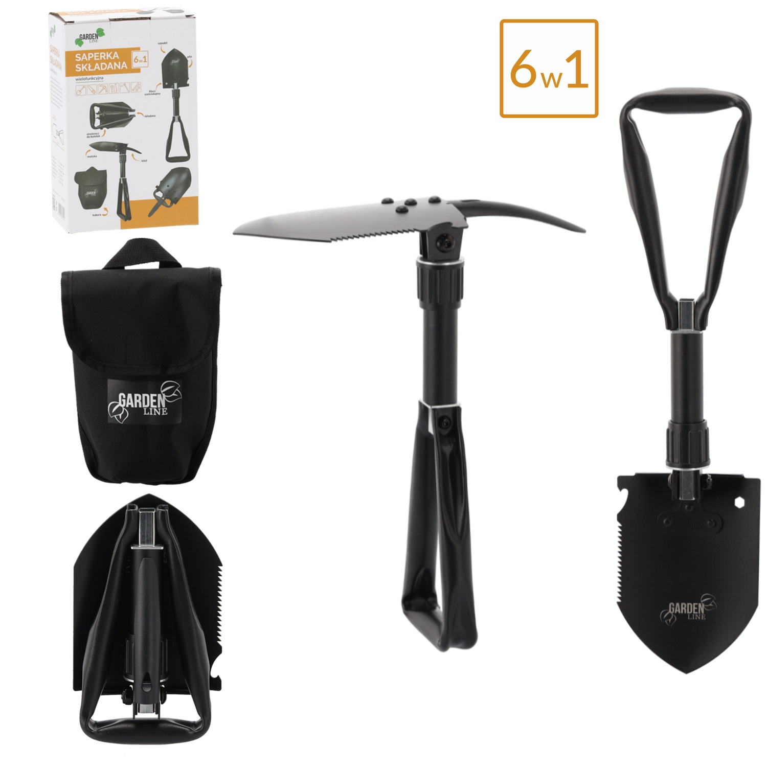 Táto odolná skladacia sapérka kombinuje lopatku, motyku, pílu, krumpáč, šesťhranný kľúč a otvárač fliaš v jedinom nástroji. Zvládne kopanie, rozbíjanie pôdy, rezanie koreňov a konárov aj drobné outdoorové práce. Oceľový list z mangánovej ocele s pílovým ostrím a uzamykateľný kĺb zaistia stabilitu pri záťaži.