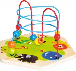 Mnohostenná motorická hračka zaujme zvedavé deti pestrými farbami a množstvom ponúkaných aktivít obohatených o didaktický rozmer. Možno viesť koráliky v bludisku, počítať guľôčky, posúvať ikonami zvieratiek, otáčať nimi a priraďovať im potravu, otáčať ozubenými kolieskami, vkladať kocky a učiť sa rozpoznávať čas. Hračka je robustná, vyrobená z hrubej preglejky. Hlavné vlastnosti: kocka s vekom a 3 dielmi vkladacej skladačky, rozvíjajte orientáciu v priestore aj čase, priraďujte tvary a farby, precvičujte jemnú motoriku, robustné drevené prevedenie
