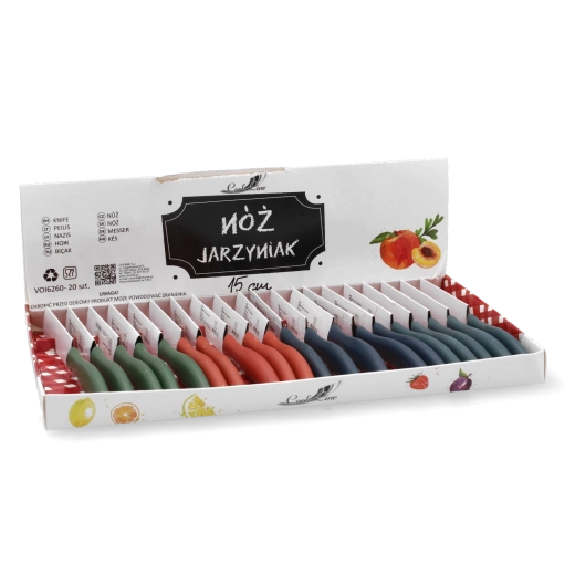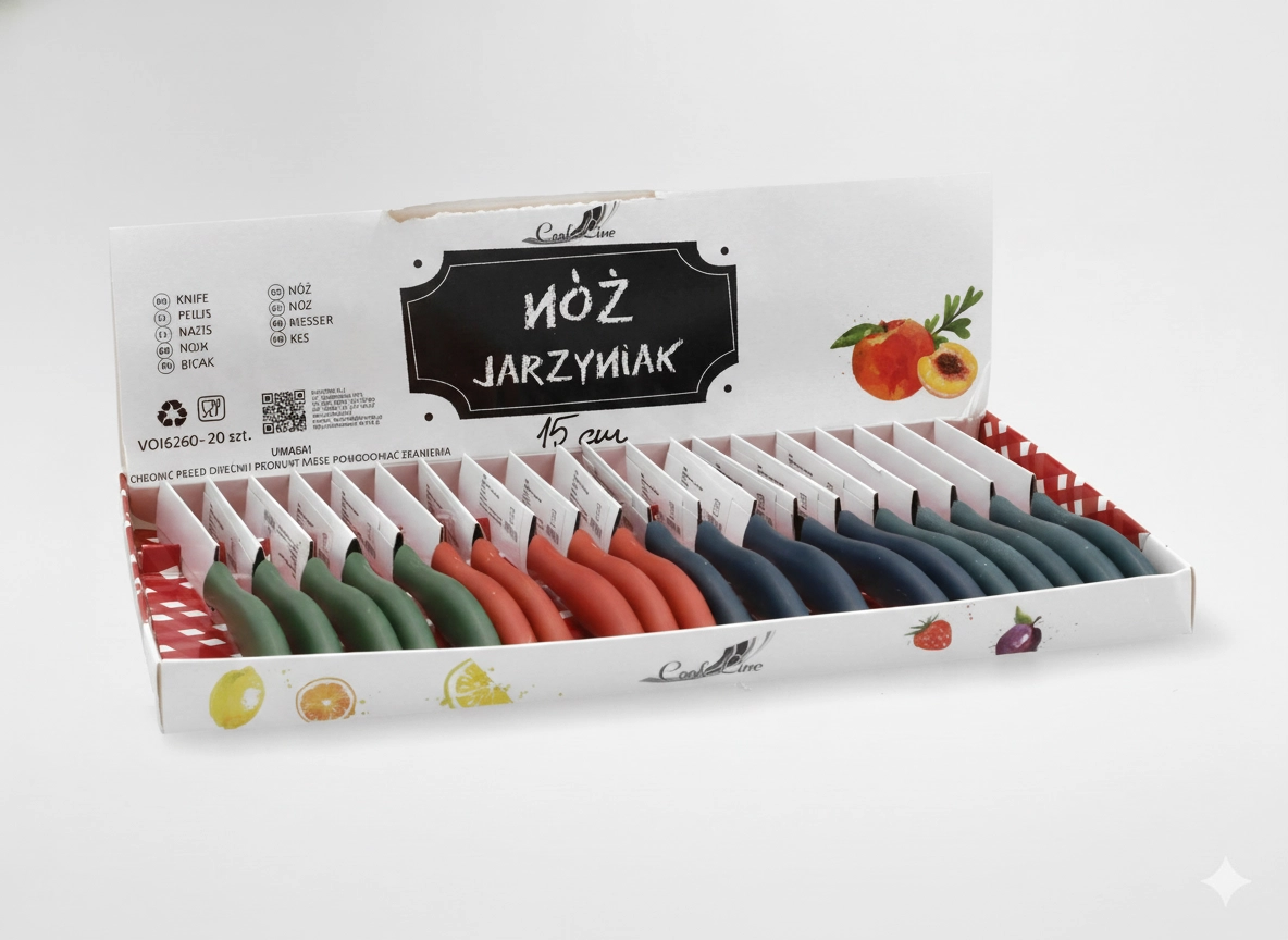Praktický nôž na zeleninu s dĺžkou čepele 15 cm na presné krájanie ovocia aj zeleniny. Ergonomická rukoväť zabezpečí pohodlné používanie a v balení je hneď 20 kusov – ideálne pre reštaurácie, catering aj domácnosti. Univerzálna dĺžka čepele, spoľahlivý výkon a výhodné balenie pre každodennú prácu v kuchyni.