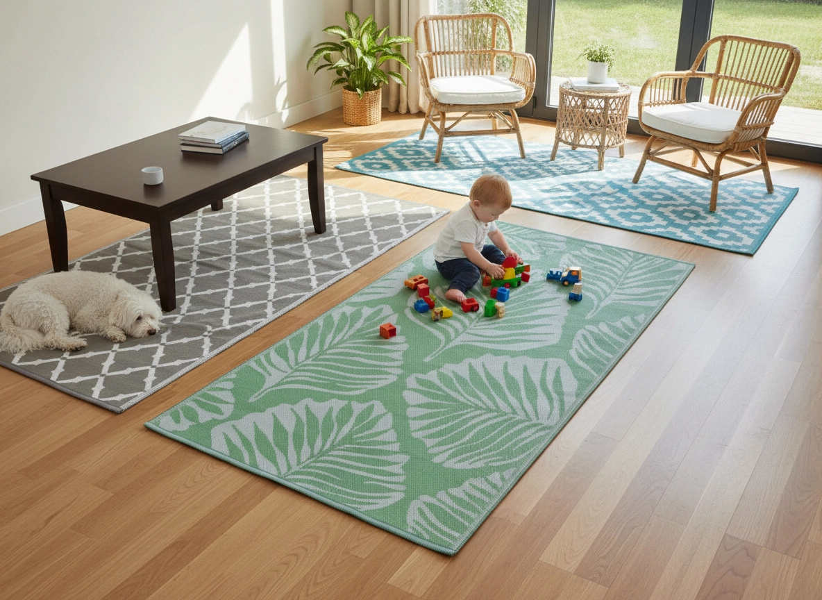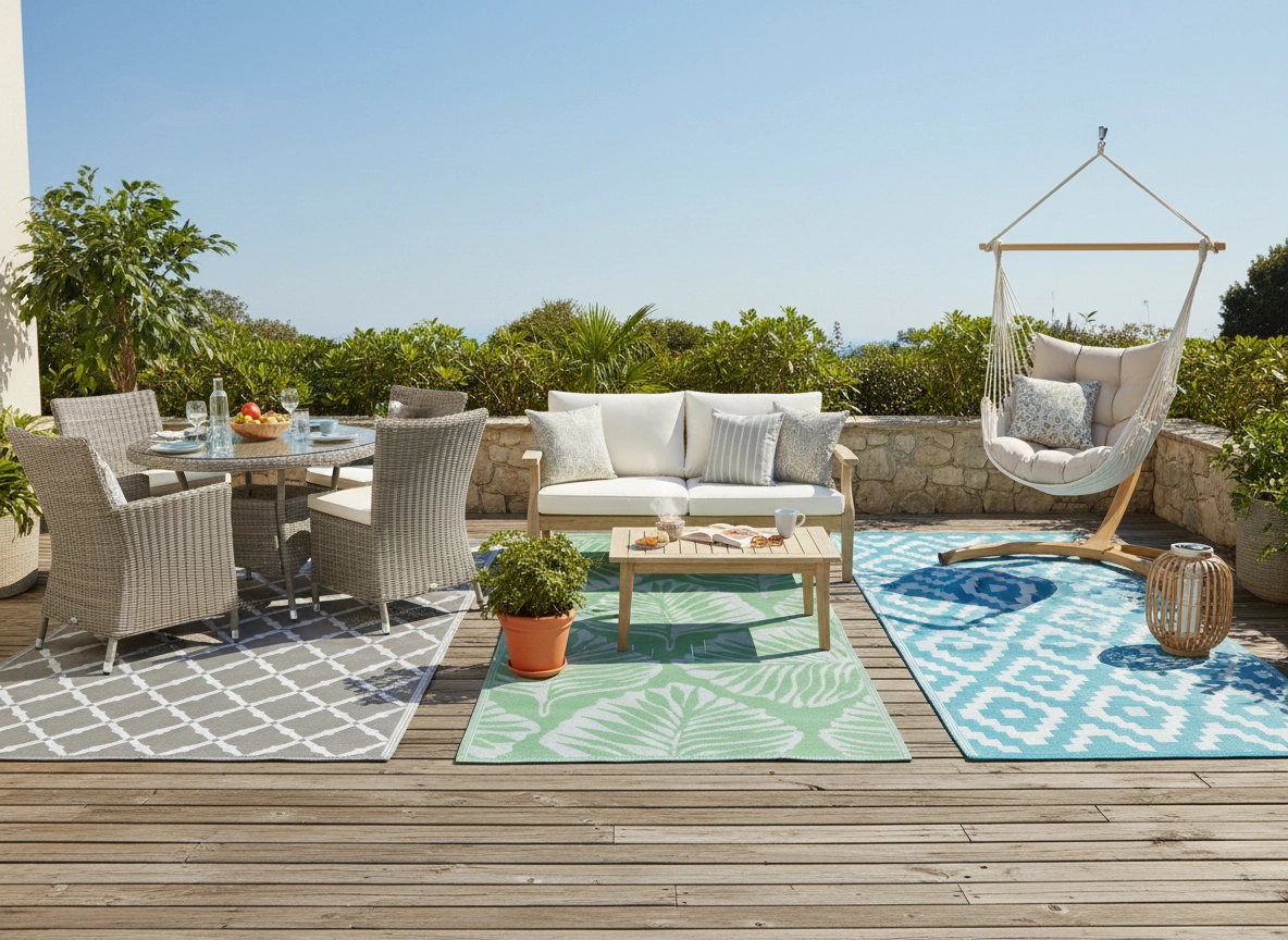 Plochý koberec z polypropylénu je odolný voči vlhkosti a počasiu, rýchlo schne a jednoducho sa čistí – ideálna voľba na celosezónne použitie vonku.