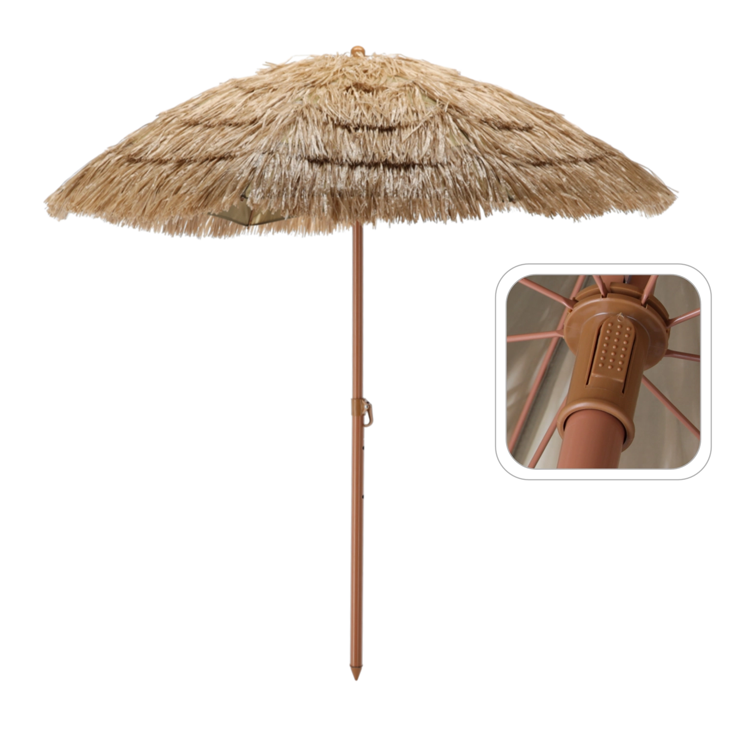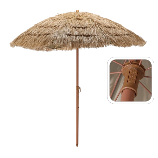 Vneste si domov atmosféru trópov s havajským plážovým slnečníkom, ktorý kombinuje štýlový exotický vzhľad s účinnou ochranou pred slnkom. Robustná oceľová konštrukcia s 8 rebrami a slamový vzhľad z PP vlákien zaistia tieň a pohodlie na pláži, pri bazéne aj na záhrade.