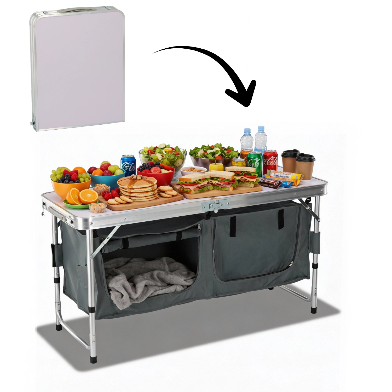 Priestranný plát poskytne pohodlné miesto na krájanie a servírovanie, zatiaľ čo dve textilné skrine so zipsami udržia potraviny a riad čisté a po ruke.