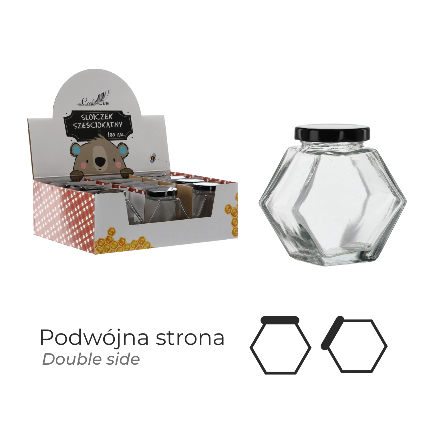Praktický šesťhranný pohár s objemom 180 ml so skrutkovacím viečkom na bezpečné uzavretie. Ideálny na med, džemy, koreniny a ďalšie drobné potraviny. Dodáva sa v balení po 12 kusoch na prehľadnú prezentáciu aj pohodlný predaj.