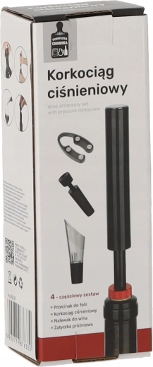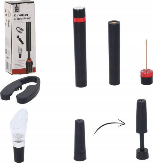 Elegantná darčeková sada pre milovníkov vína obsahuje všetko potrebné na pohodlné otvorenie a servírovanie: tlakový vývrtka, rezač fólie, uzáver fľaše a nalievací nástavec s aerátorom. Kombinácia nehrdzavejúcej ocele a odolného plastu v čiernom prevedení zaručuje dlhú životnosť a moderný vzhľad.