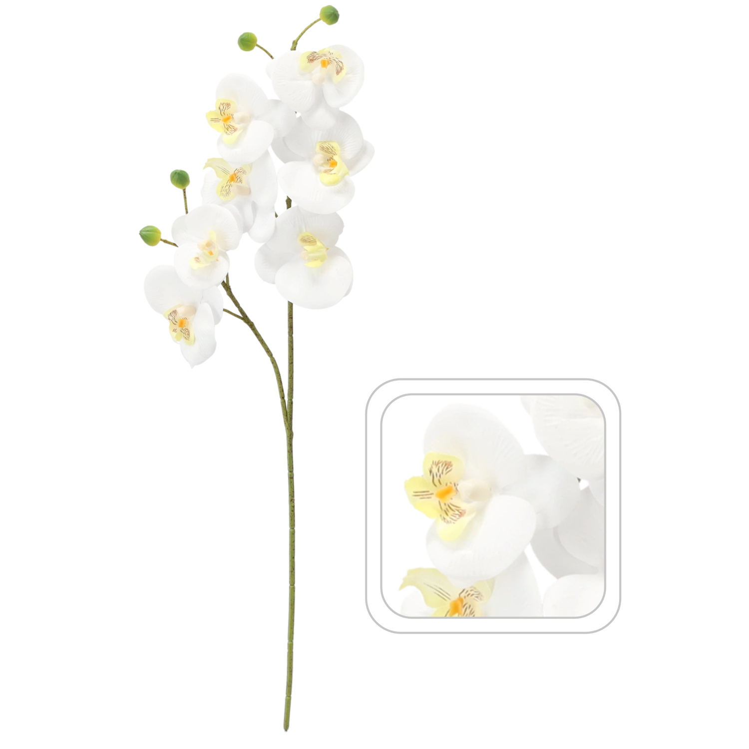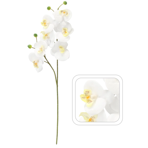Vneste do priestoru nadčasovú krásu s umelou vetvou orchidey v bielej farbe. Realistické kvety a detailné prevedenie vytvárajú dojem čerstvo rozkvitnutej rastliny, ktorá však nevyžaduje žiadnu údržbu. Perfektná voľba pre moderné aj klasické interiéry, svadby, recepcie či sezónne dekorácie.