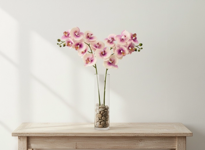 Elegantná umelá vetva orchidey s výškou 82 cm očarí svojím realistickým vzhľadom a jemným spojením ružovo‑bielych kvetov s fialovým akcentom. Skvelá dekorácia do obývačky, spálne, kancelárie aj recepcie bez potreby údržby.