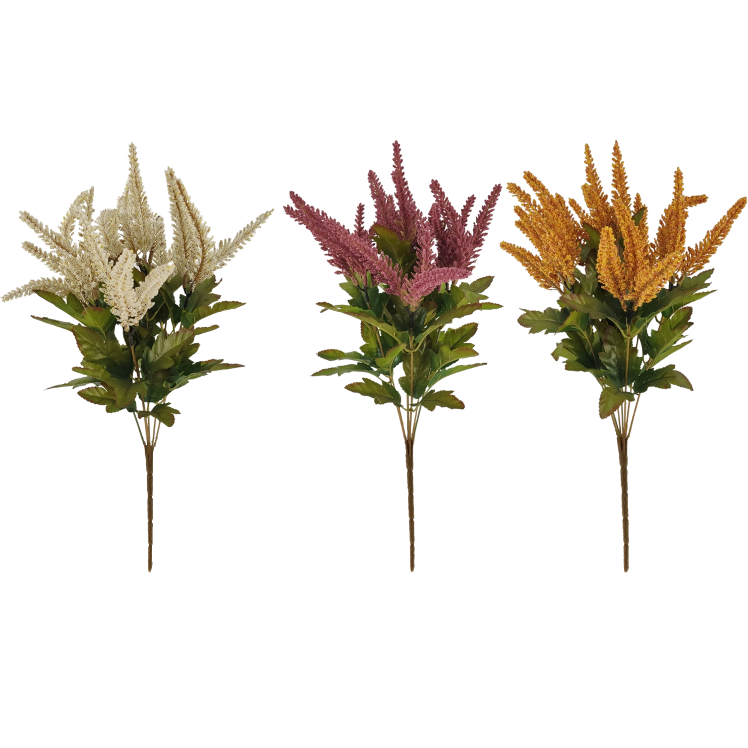 Dekoratívna umelá kytica vresu s výškou 44 cm dodá interiéru prírodné čaro bez nutnosti údržby. Ponúka mix farieb (krémová/žltá, fialová, oranžová) a realisticky spracované klasy a listy, ktoré vyzerajú sviežo po celý rok. Ideálna do váz, aranžmánov aj sezónnych dekorácií doma, v kancelárii či na podujatiach.