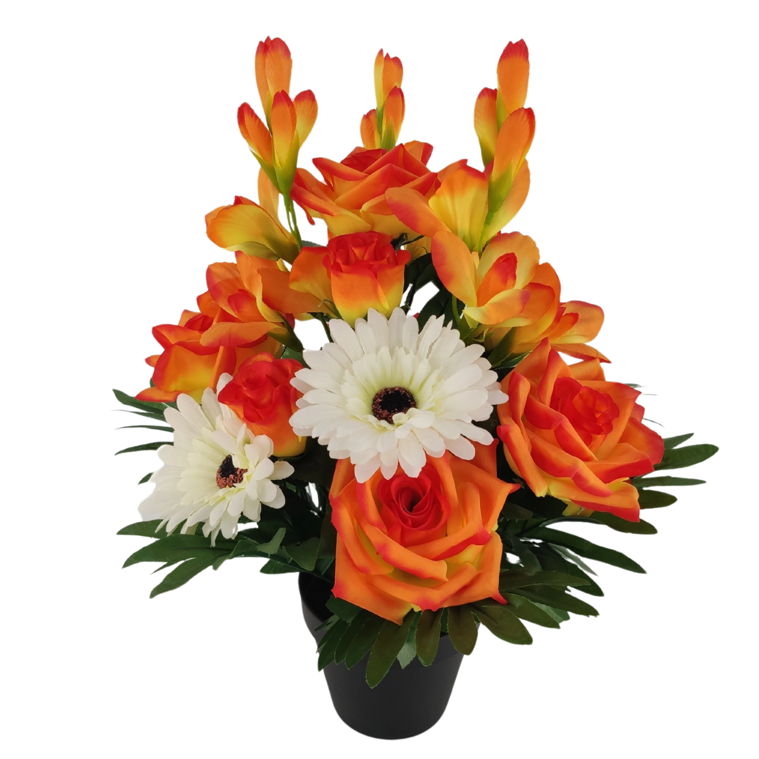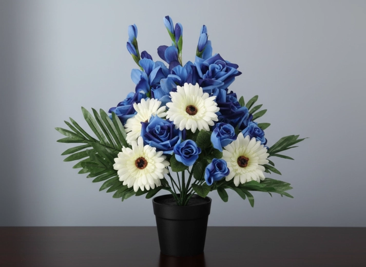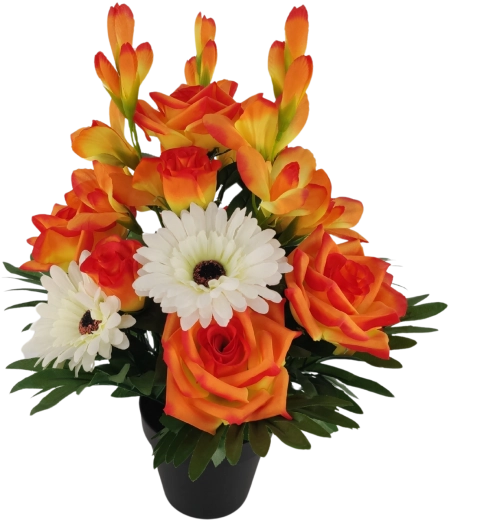 Štýlová umelá kvetinová dekorácia v elegantnom kvetináči s výškou 43 cm. Realistické kvety a bohaté zelené listy dodajú interiéru sviežosť po celý rok – bez polievania a údržby. K dispozícii v 3 farebných variantoch: oranžovej, modrej a ružovej. Ideálne na komodu, stôl, recepciu aj pracovný stôl.
