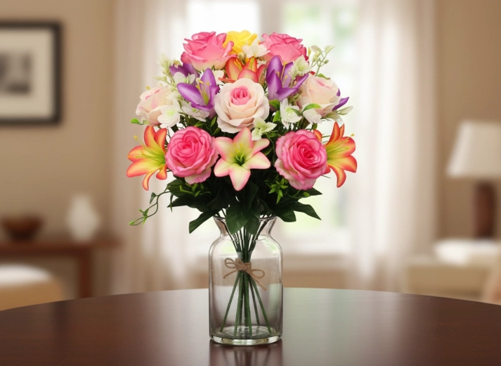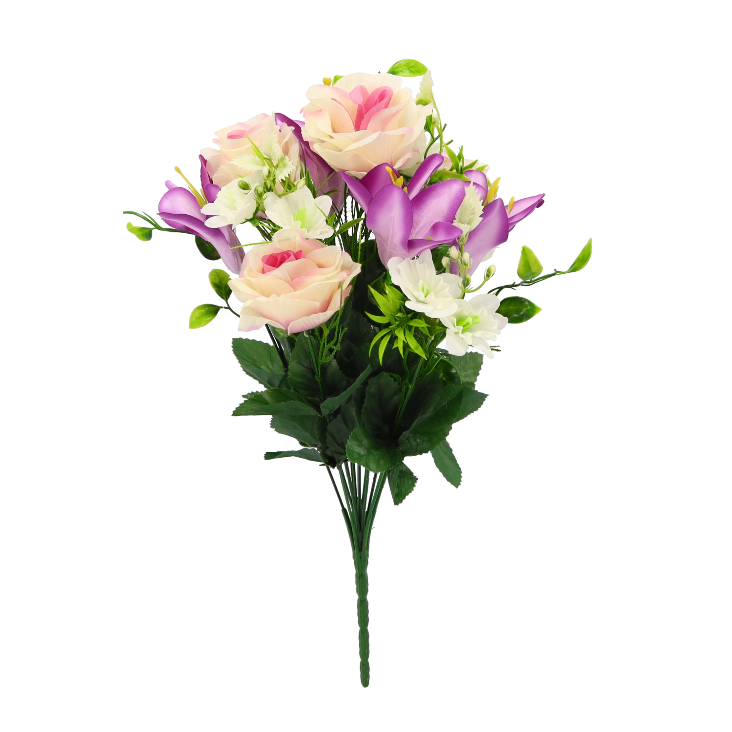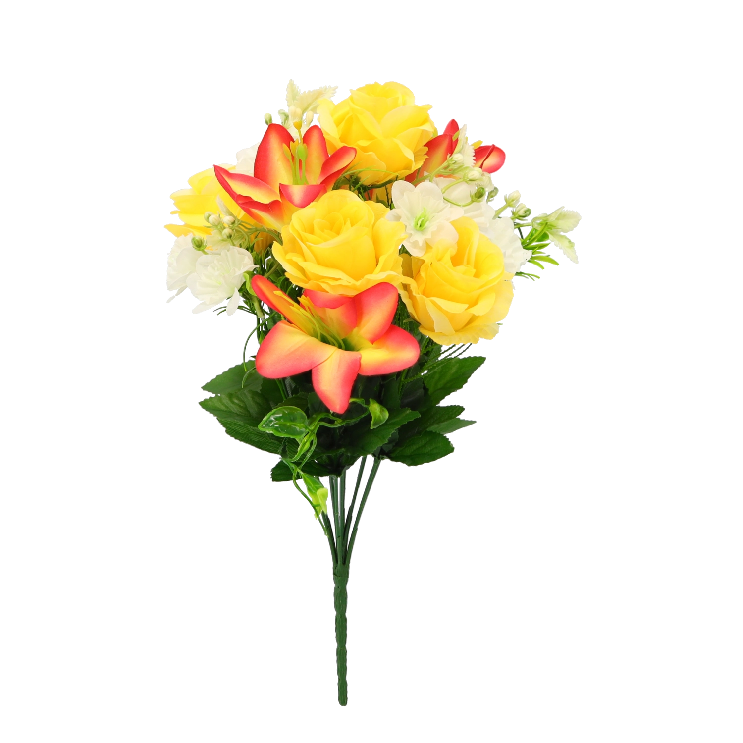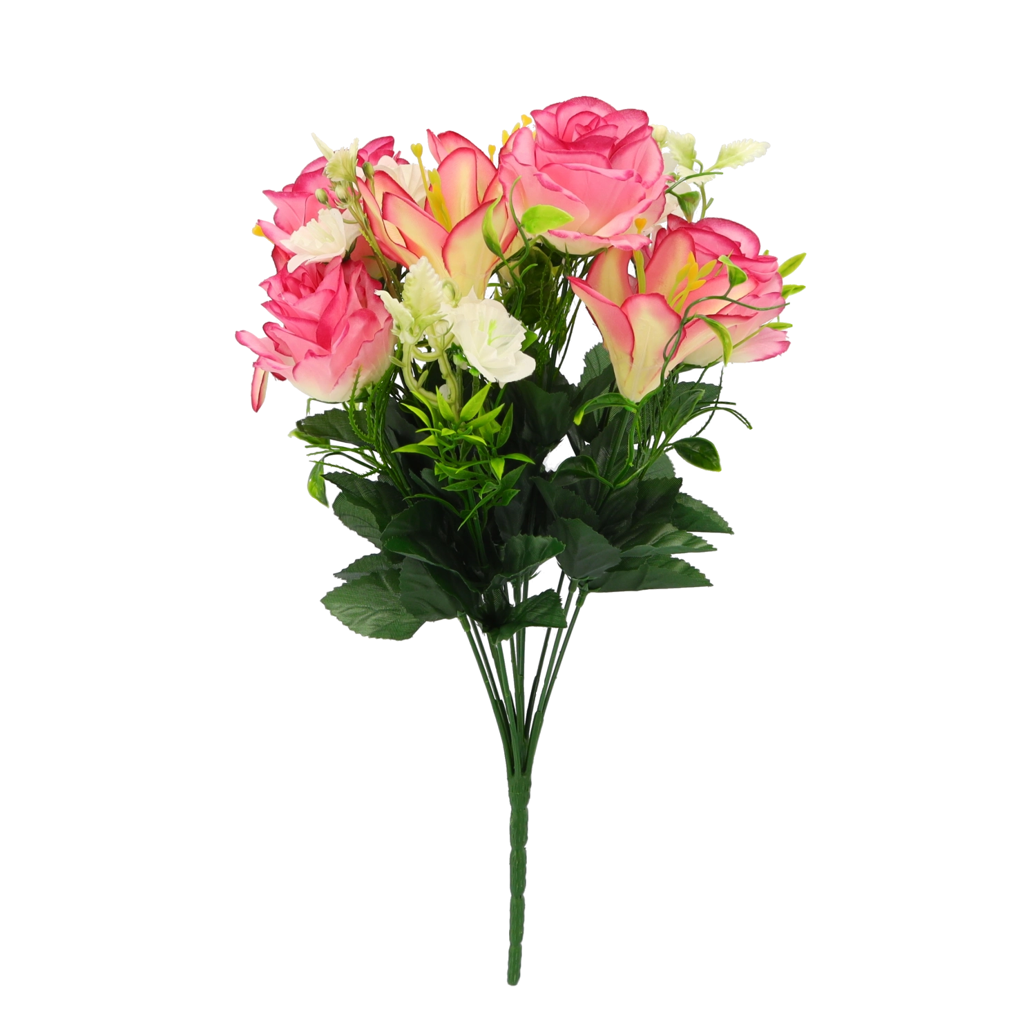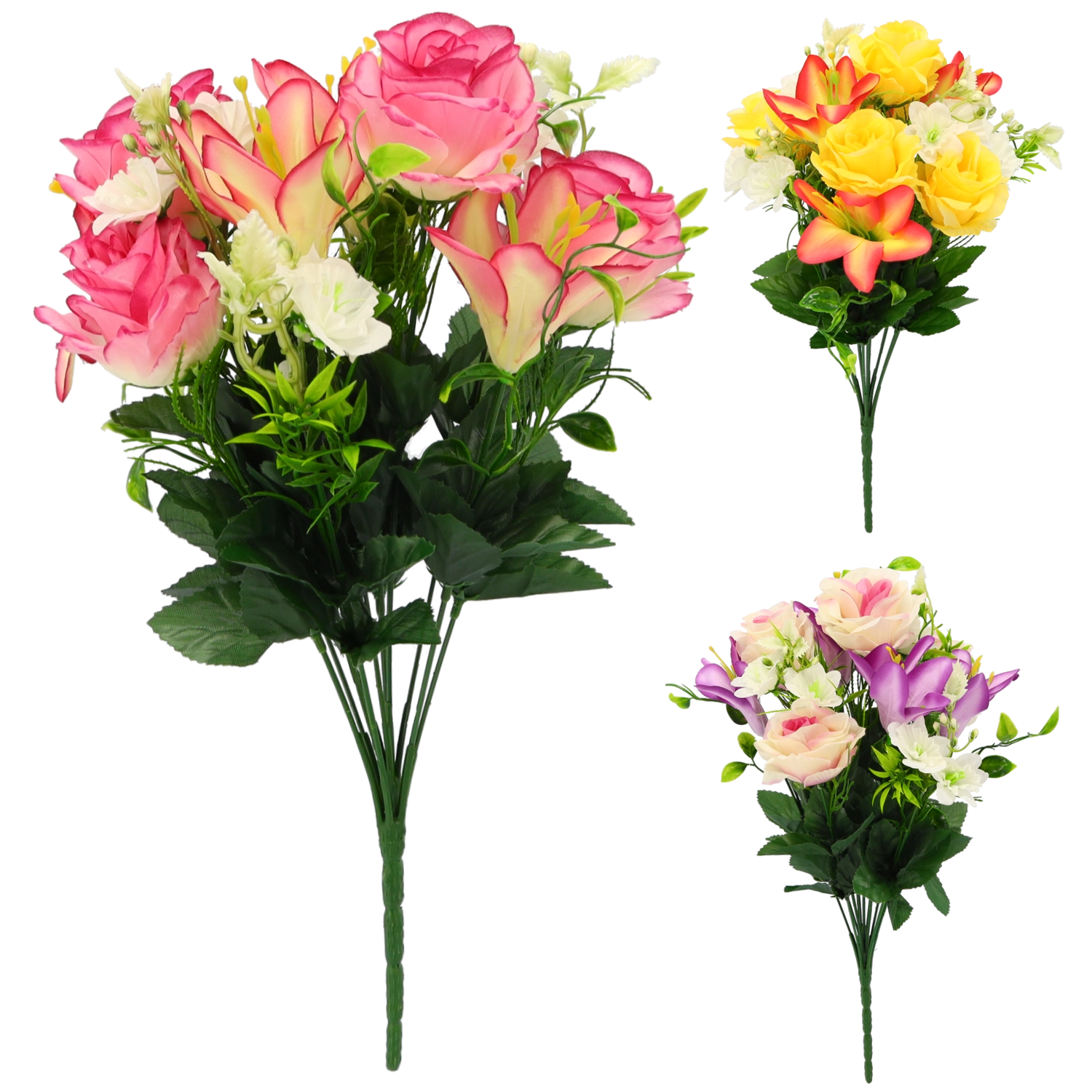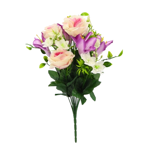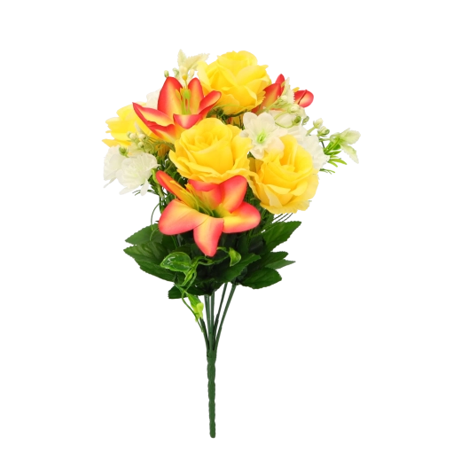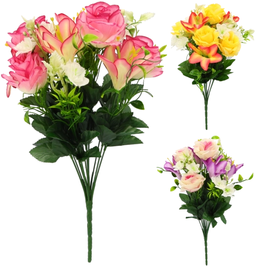 Štýlová umelá kytica, ktorá spája klasické ruže a elegantné ľalie s bohatou zeleňou. Vďaka rozmerom 43 × 25 × 25 cm a prevedeniu v mixe farieb pôsobí prirodzene a sviežo po celý rok. Realistické detaily, odolné materiály a nulové nároky na údržbu z nej robia perfektnú dekoráciu do obývačky, spálne, kancelárie aj recepcie.