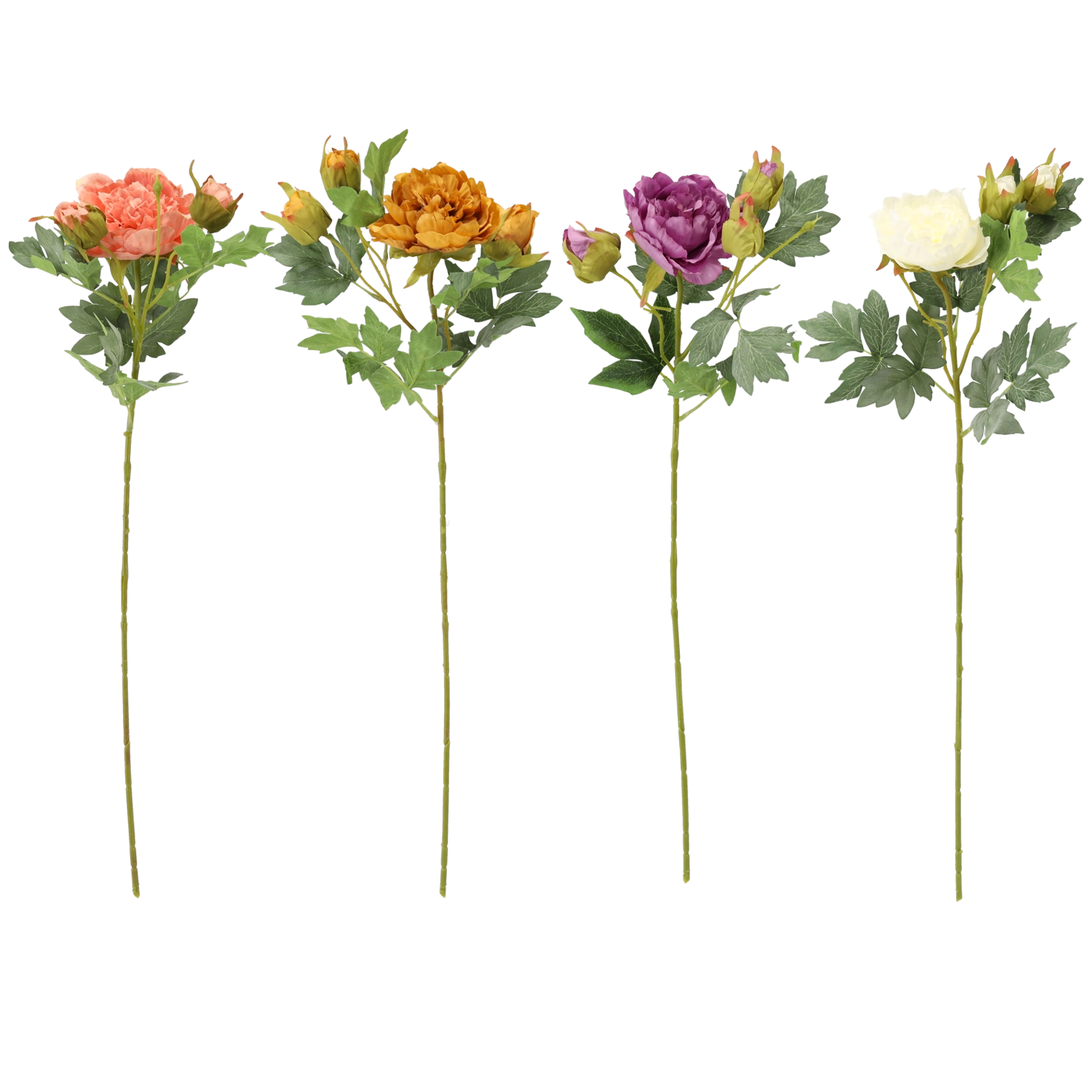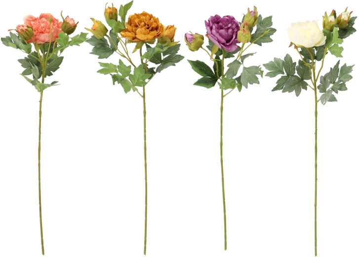 Mix farieb (napr. broskyňová, fialová, horčicová, krémová) umožní vytvoriť štýlové aranžmány od jemne romantických po výrazne moderné. Umelé kvety sú opakovane použiteľné, farebne stály a bez nárokov na starostlivosť – skvelá voľba na dlhodobú dekoráciu.