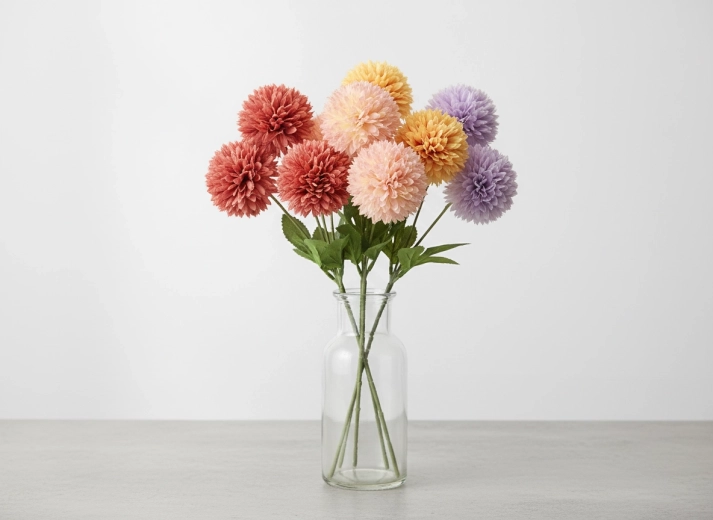 Vneste do interiéru sviežosť a farby pomocou umelej vetvičky georgín, ktorá vyzerá ako živá a zároveň nevyžaduje žiadnu starostlivosť. Mix odtieňov ružovej, broskyňovej, žltej a fialovej ľahko zladíte s rôznymi štýlmi bývania – od moderného po klasický.