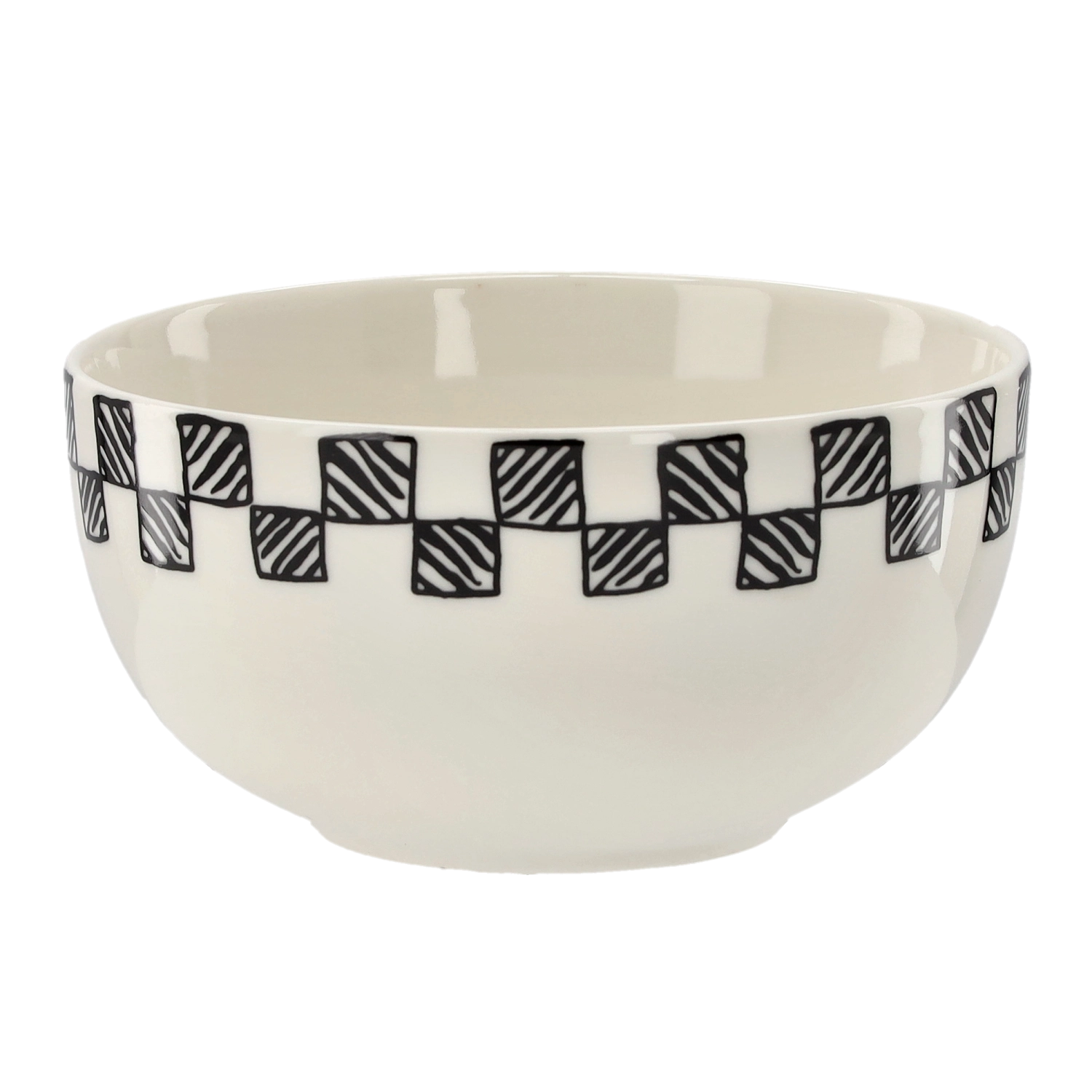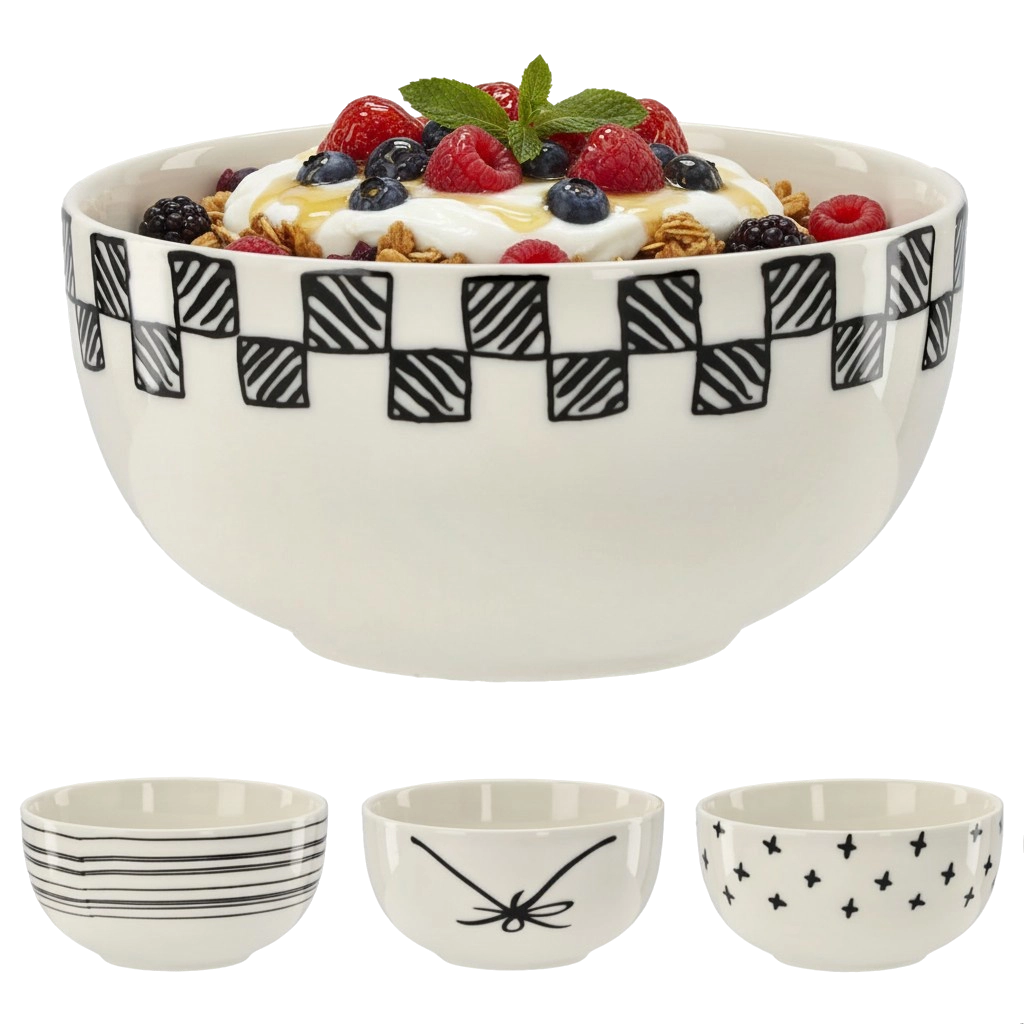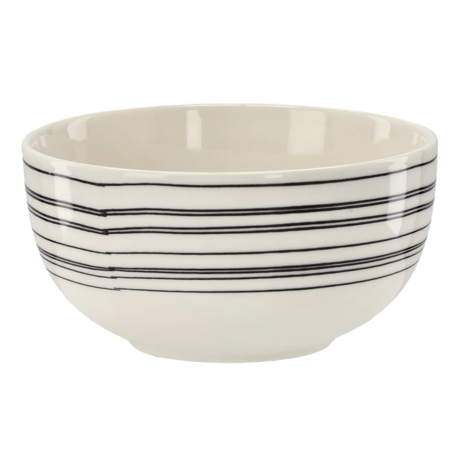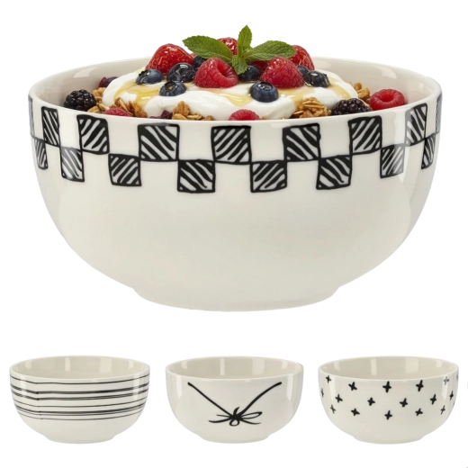 Doprajte si dokonalé servírovanie s miskou Black & White s objemom 550 ml. Vďaka kvalitnej keramike a lesklej glazúre sa hodí na raňajkové cereálie, polievky, šaláty aj snacky. Minimalistické čiernobiele motívy zvýraznia každý stôl a ľahko ich skombinujete s ďalším riadom.