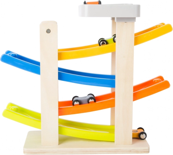 Táto fascinujúca klip klap dráha je vyrobená z kombinácie dreva a plastu, čo zabezpečuje jej dlhú životnosť a bezproblémové používanie. S jej štyrmi farebnými rampami deti môžu sledovať, ako sa autíčka rútia nadol s úžasnými skokmi a otočkami. Je ideálna pre deti od 18 mesiacov, ktoré sa rady hrajú a zároveň rozvíjajú svoje motorické zručnosti.