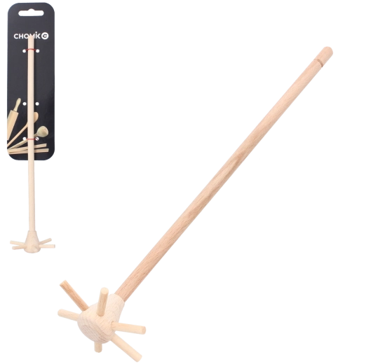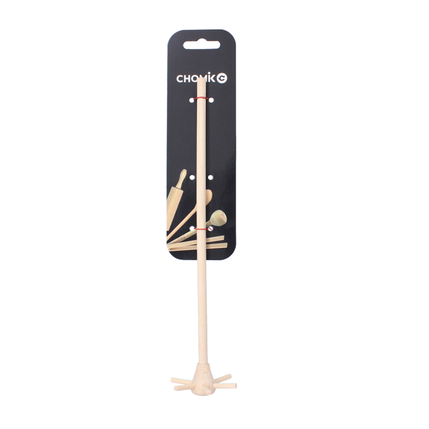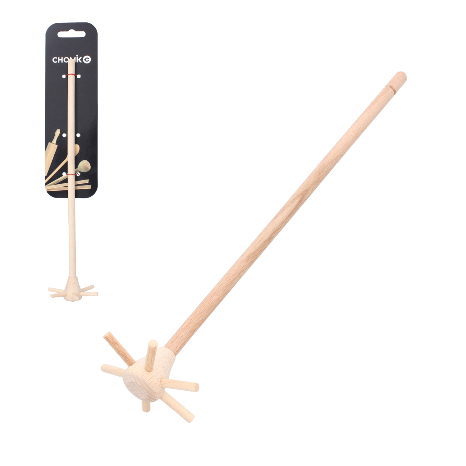 Univerzálna drevená metlička s tradičným tvarom bez problémov premieša omáčky, krémy aj polievky. Vďaka dĺžke 27 cm pohodlne dosiahne na dno hrnca a je šetrná k povrchom – nepoškriabe nepriľnavý ani smaltovaný riad.