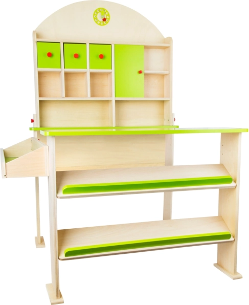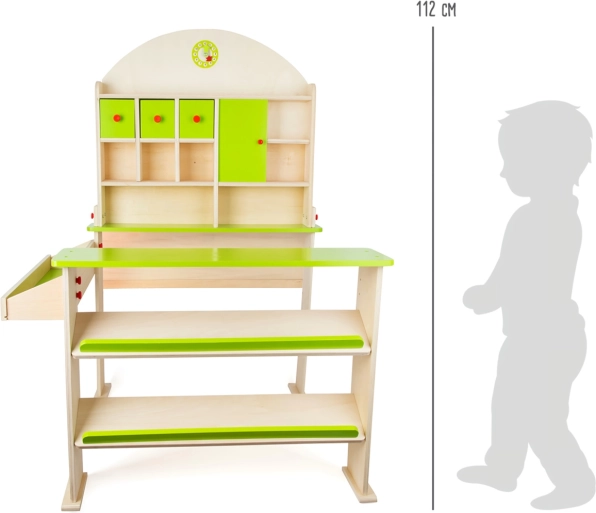 Moderný drevený predajný stánok nielenže rozvíja komunikačné a počtové zručnosti detí, ale tiež podporuje ich kreativitu. Je vybavený úložnými priestormi, ktoré zahŕňajú šikmé police na ukladanie debienok a samostatné police pre makety a tovar. Zadná stena obsahuje odkladacie plochy a skrinky s funkčnými dvierkami. Na vrchole stojana sú hodiny, ktoré deti môžu využiť na učenie času a určenie otváracích hodín.