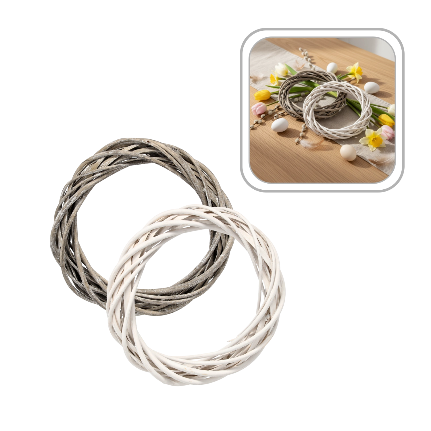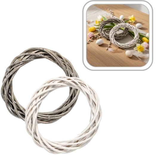 Tento univerzálny veniec z prírodného prútia skvele poslúži ako samostatná dekorácia aj ako základ pre originálne aranžmány. Neutrálne farebné prevedenie v bielej alebo sivej sa ľahko kombinuje s kvetmi, stuhami aj sezónnymi ozdobami, takže vytvoríte jedinečné jarné, veľkonočné, svadobné aj vianočné kompozície.