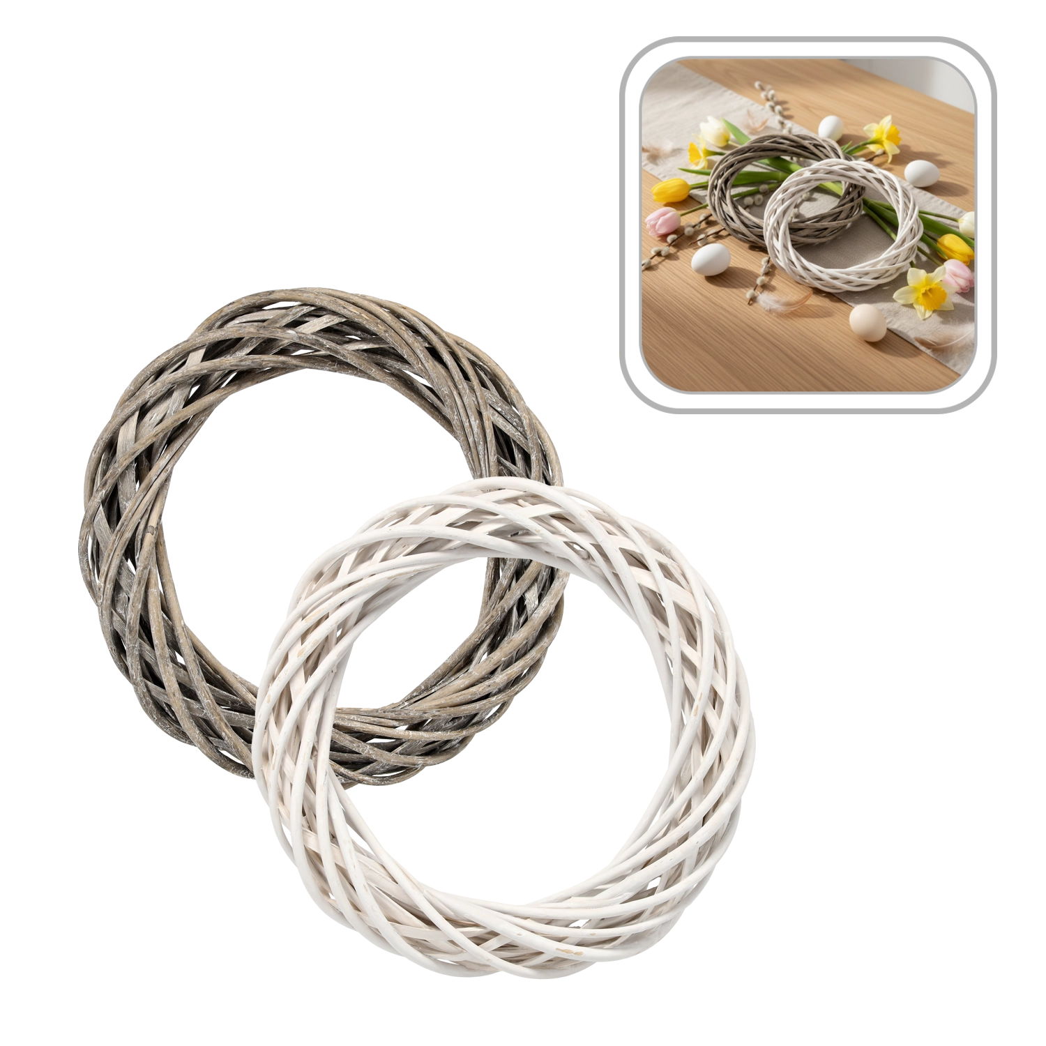 Vytvorte si originálne sezónne aranžmány behom chvíľky. Tento prútený veniec je ideálny základ pre DIY dekorácie – ľahko ho dozdobíte stuhami, umelými či sušenými kvetmi, šiškami, bobuľami alebo drobnými ozdobami podľa ročného obdobia. Neutrálne farebné prevedenie v bielej či sivej sa bez námahy zladí s akýmkoľvek štýlom.