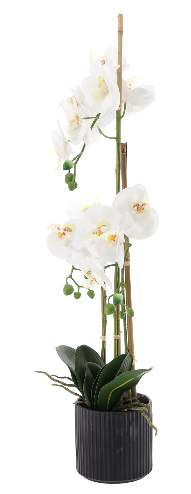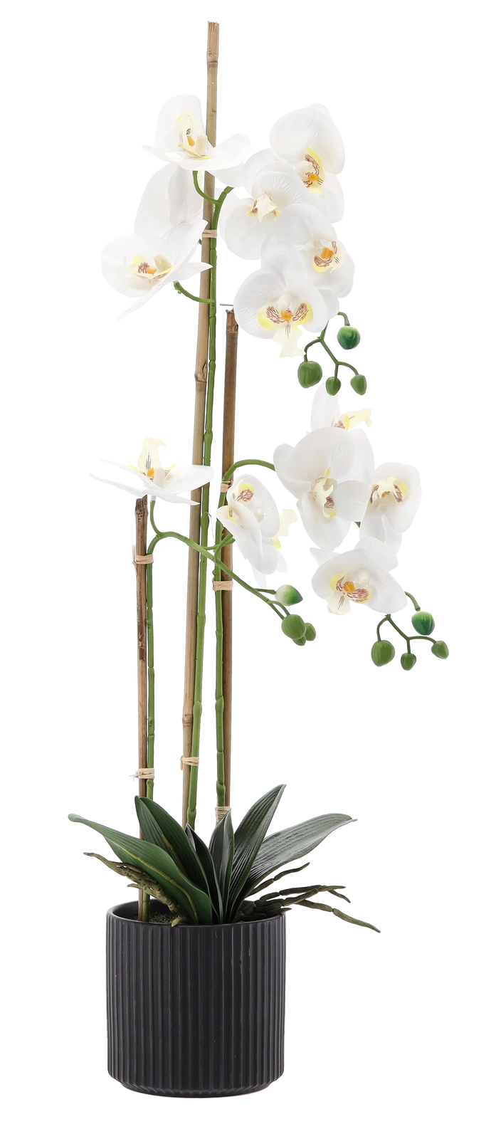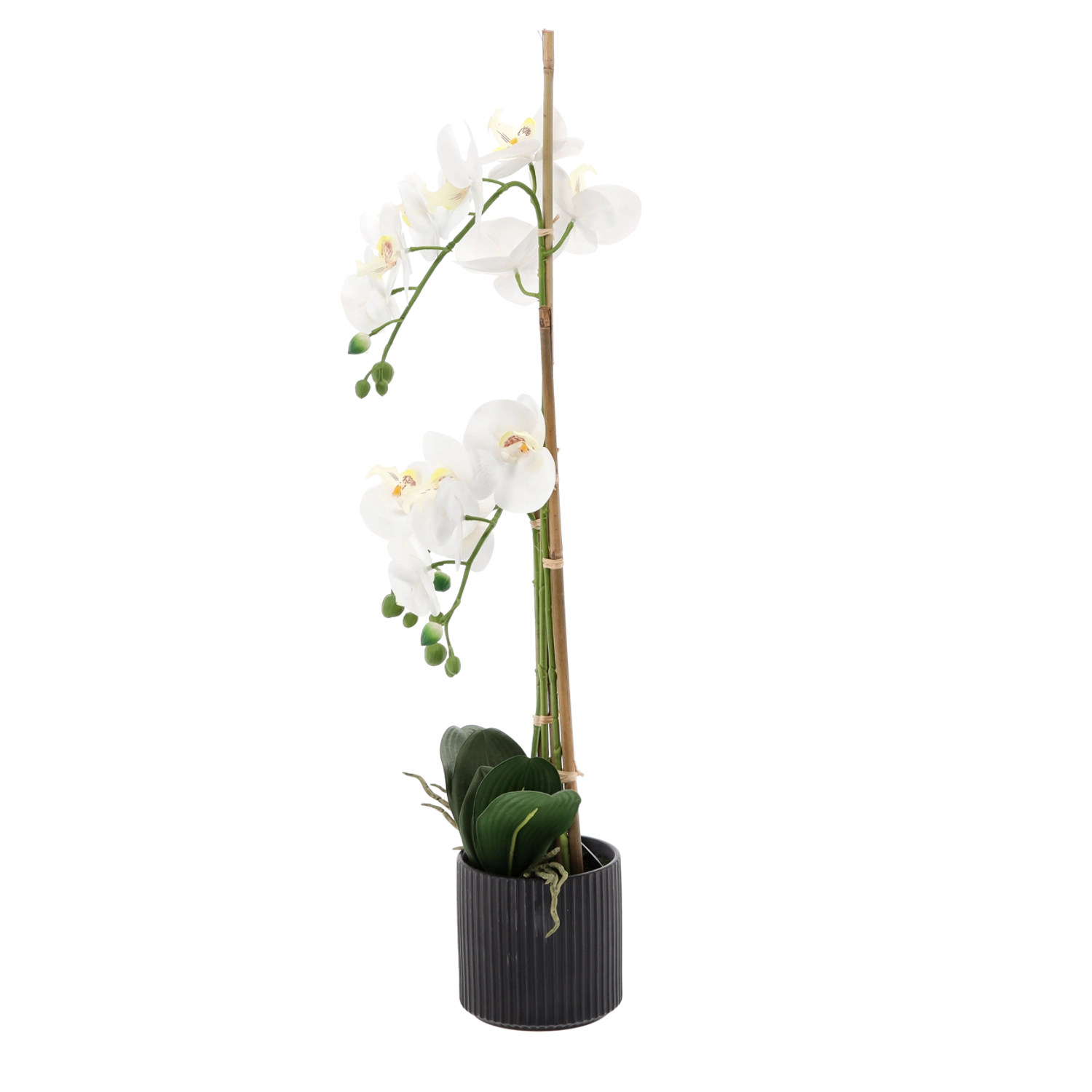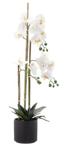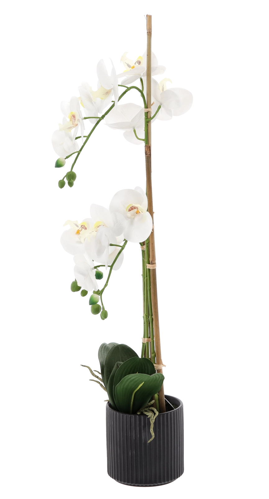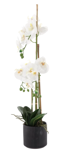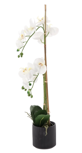 Táto dizajnová umelá orchidea je vysoká 77 cm a je osadená v decentnom čiernom vrúbkovanom kvetináči, ktorý podčiarkuje jej elegantný vzhľad. Vďaka verne spracovaným kvetom, pukom a lesklým listom prináša do priestoru prírodnú atmosféru bez nutnosti údržby.